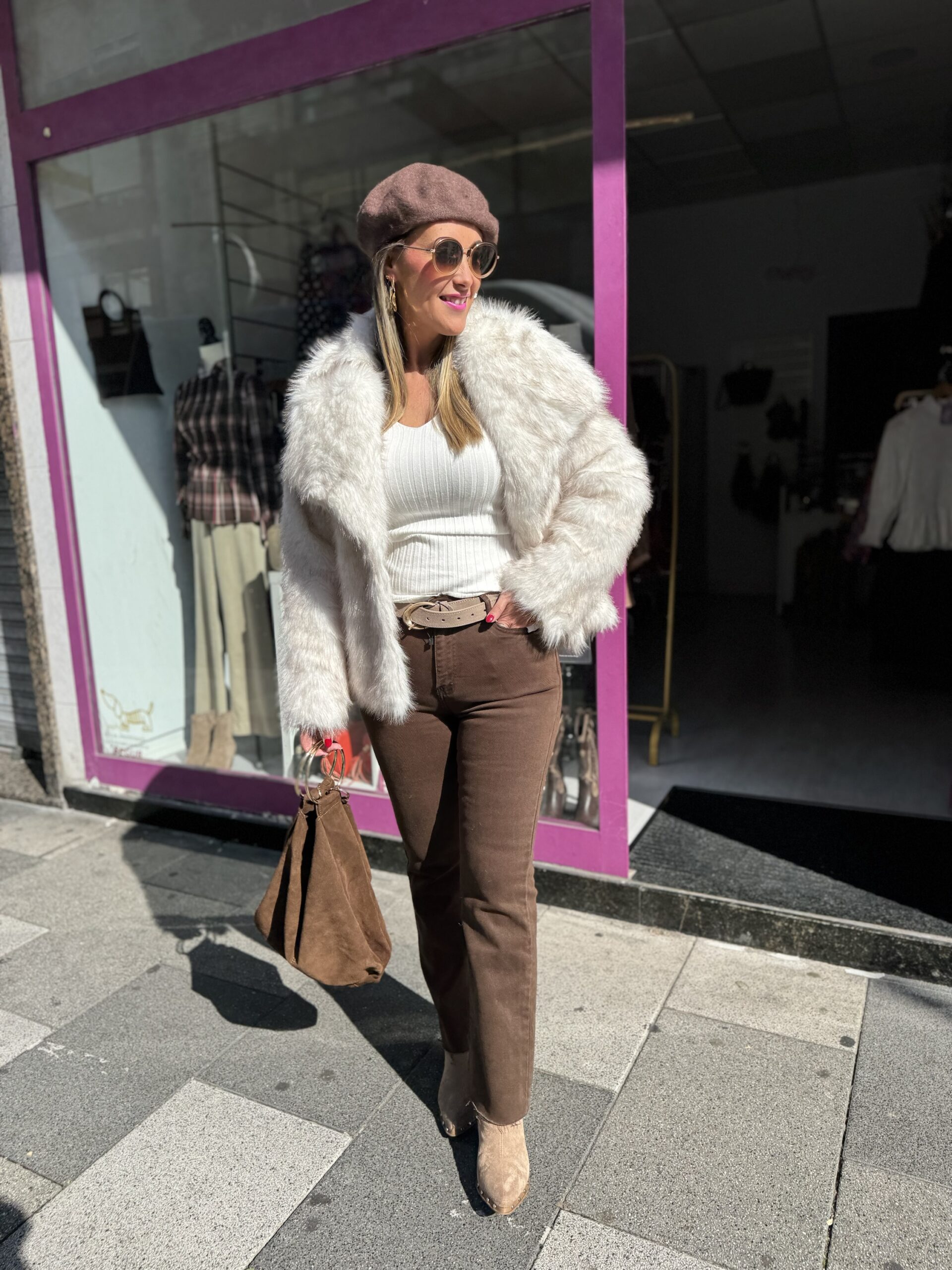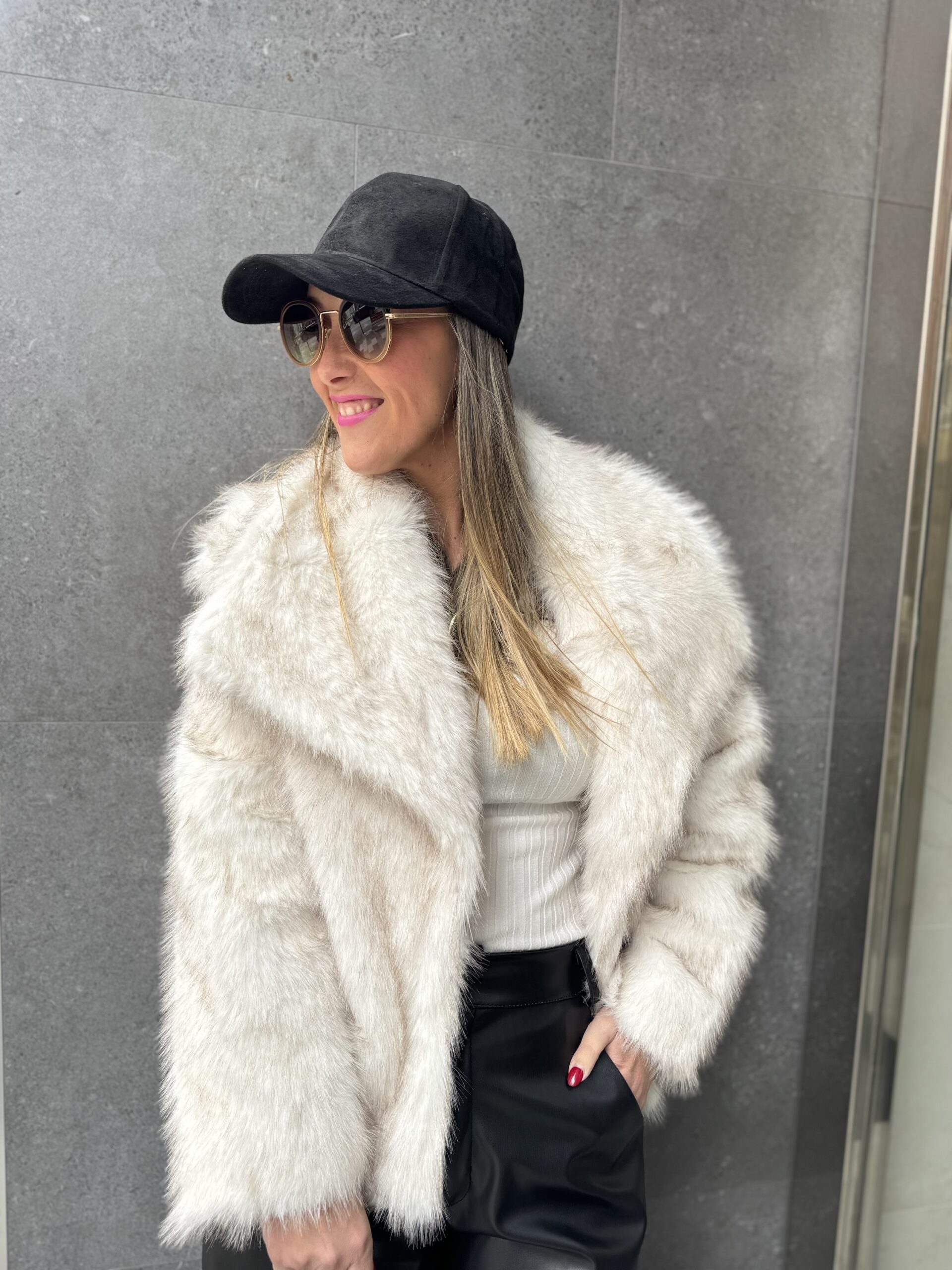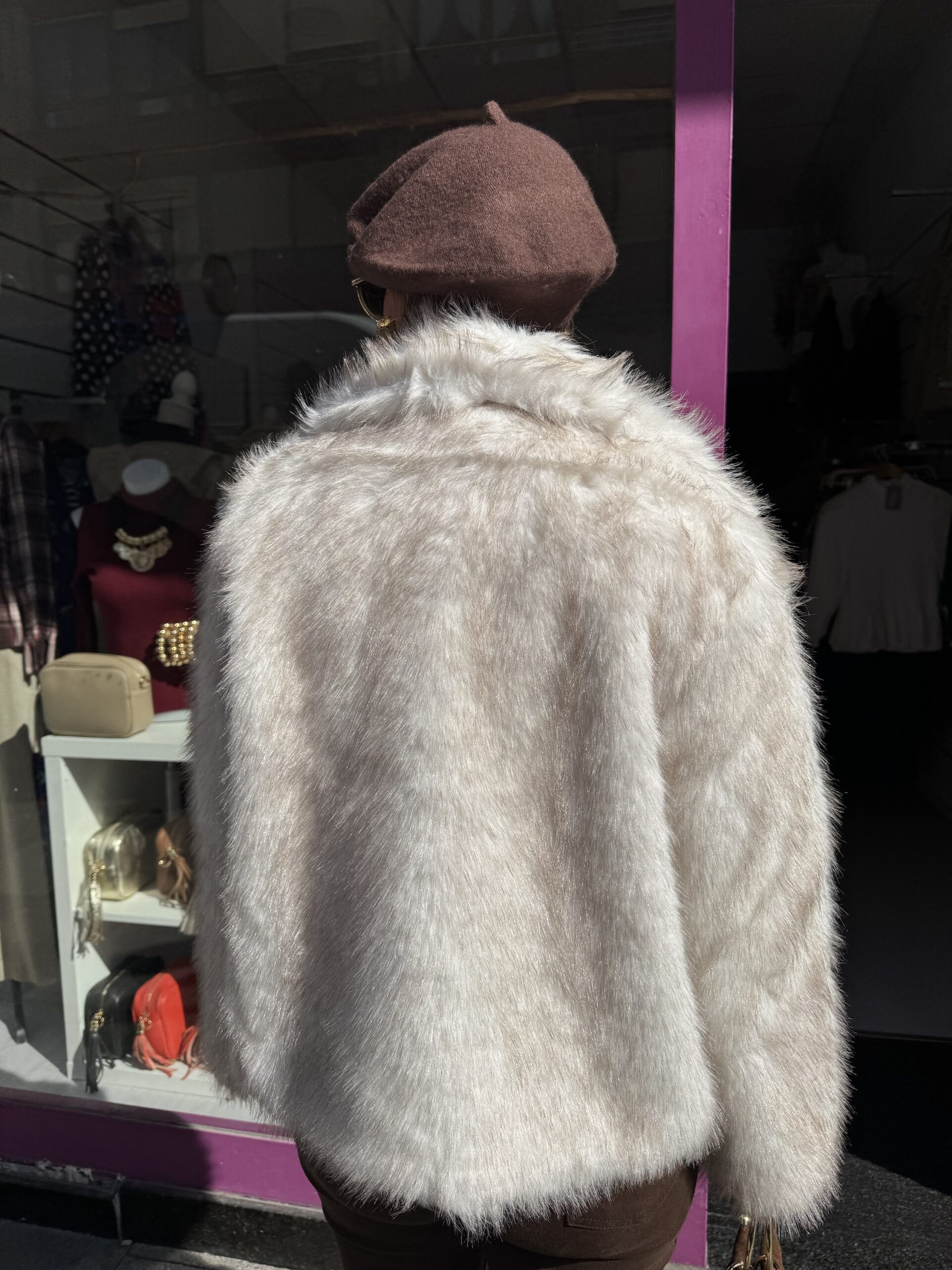 Abrigo de pelo sintético en color beige , cierre con botón delantero , totalmente forrado y bolsillos laterales .