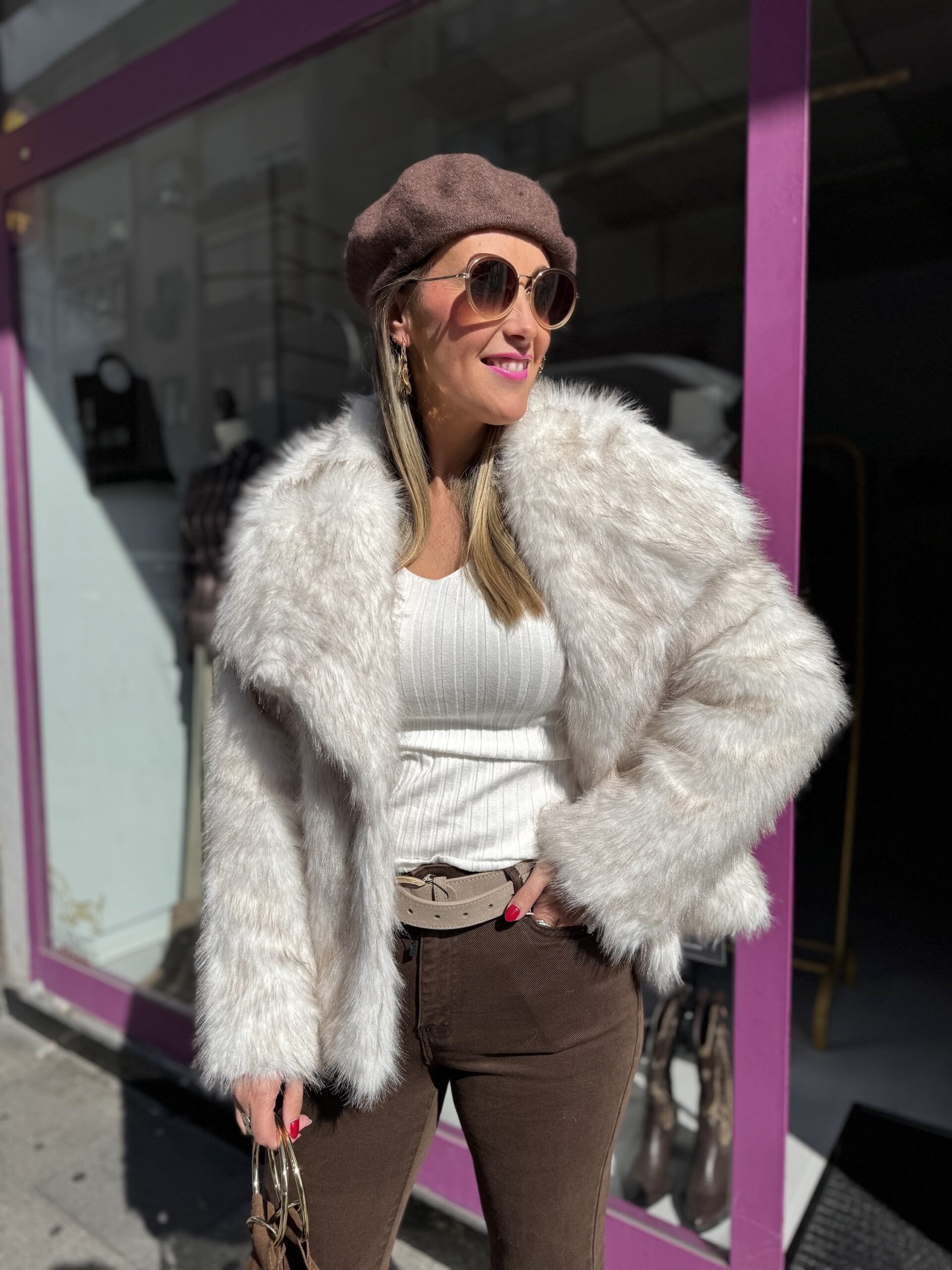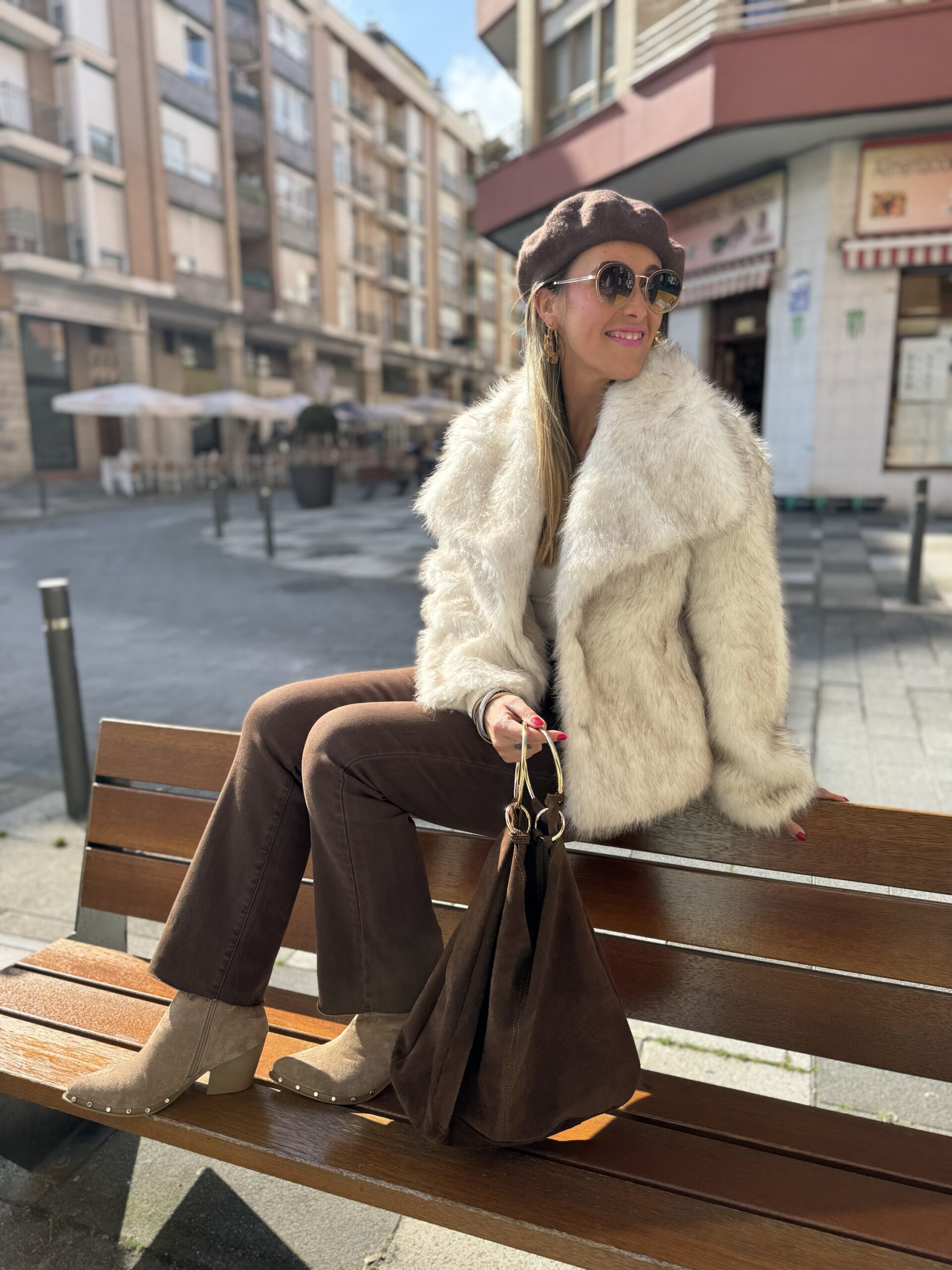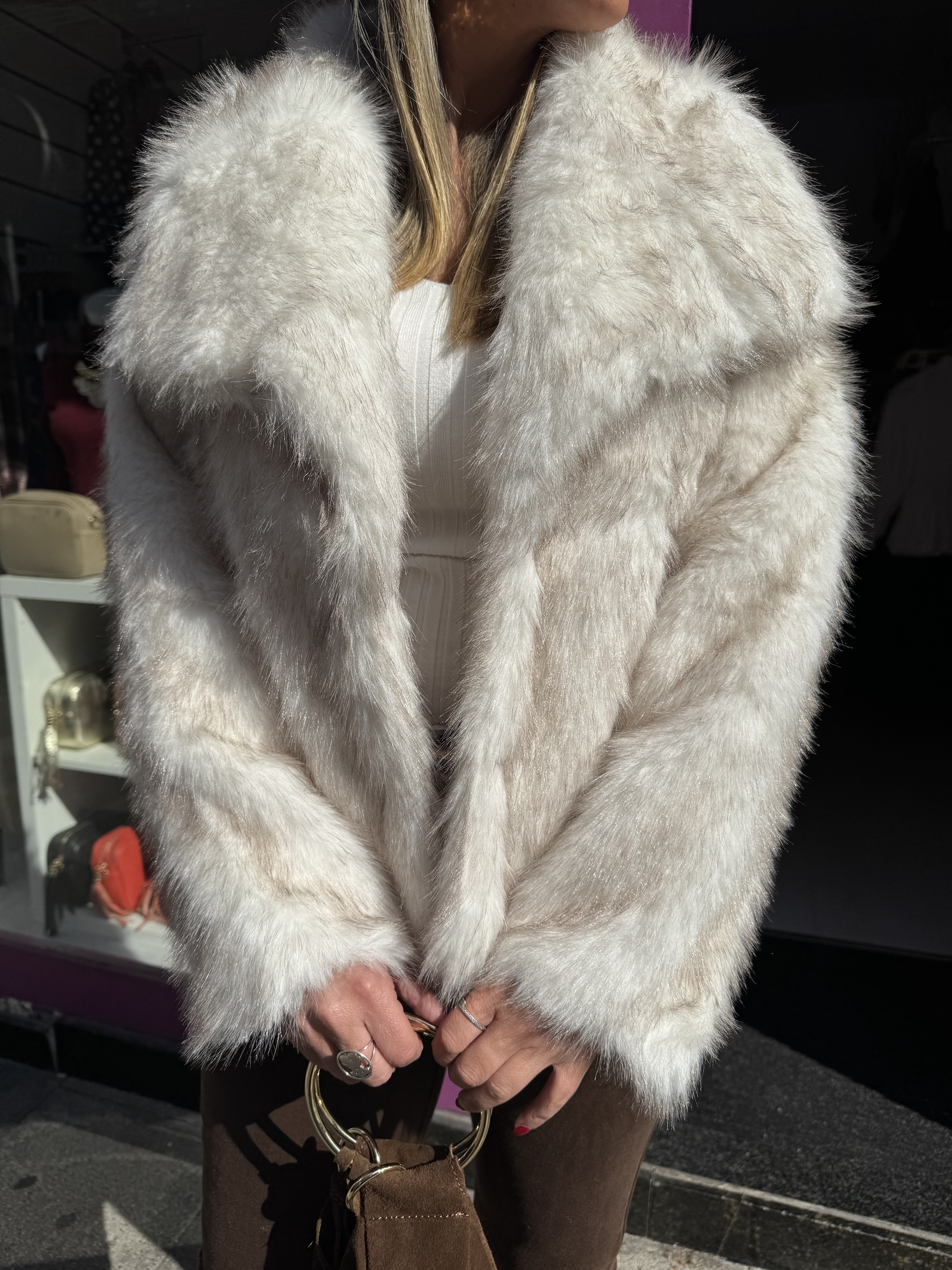 Abrigo de pelo sintético en color beige , cierre con botón delantero , totalmente forrado y bolsillos laterales .