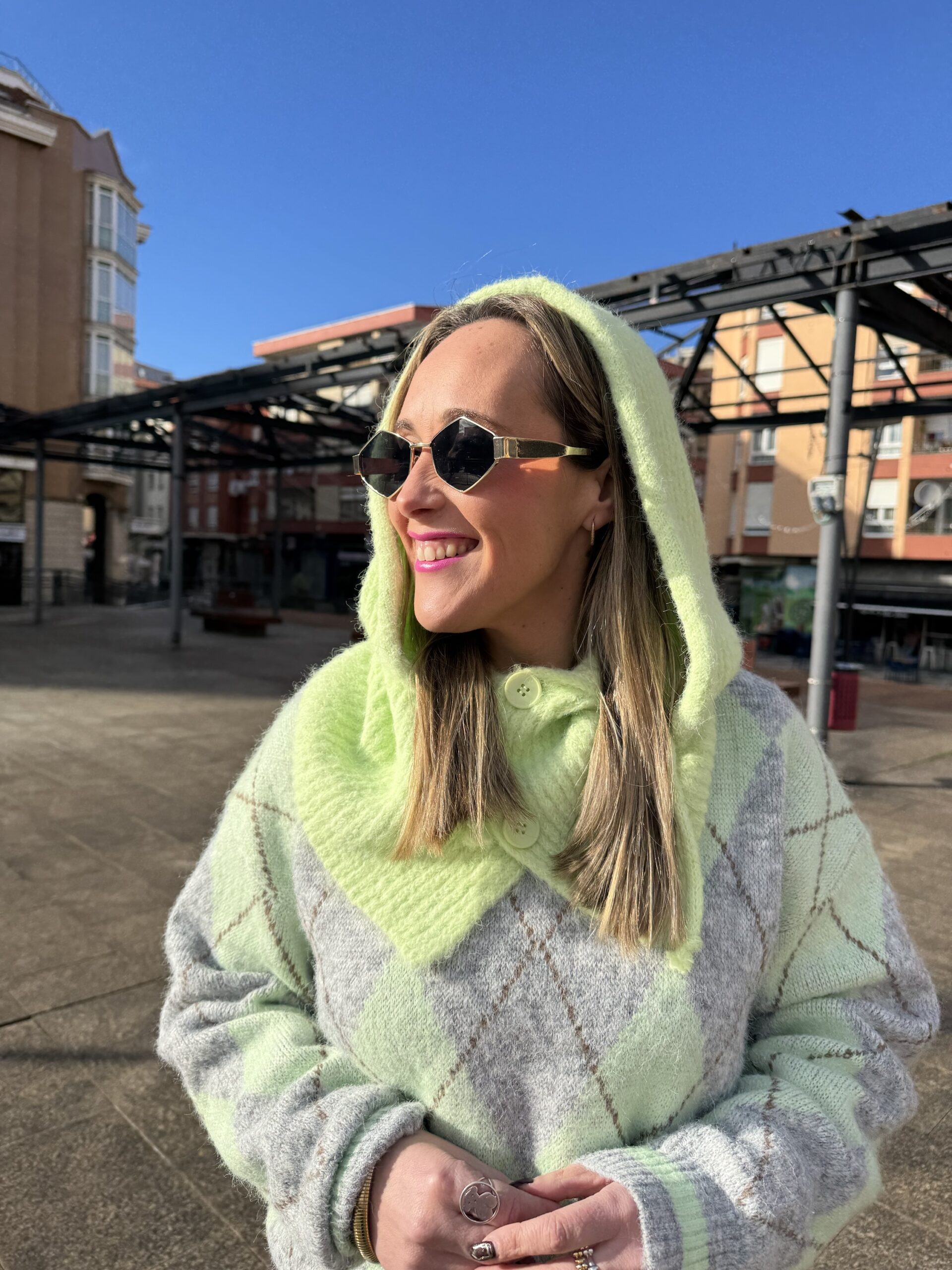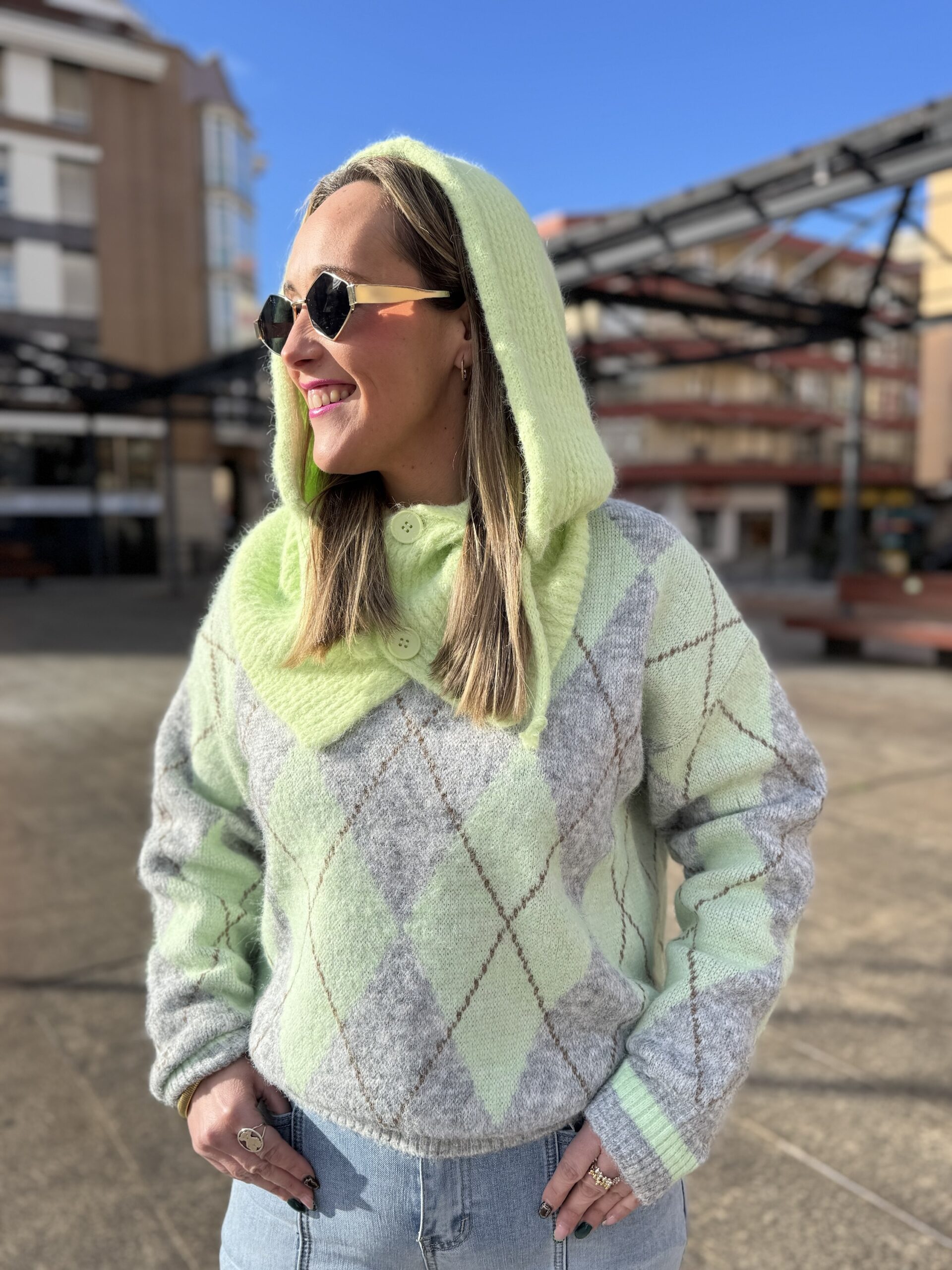 Balaclava punto con cierre botones delanteros, capucha ajustable con cordón. Color verde lima