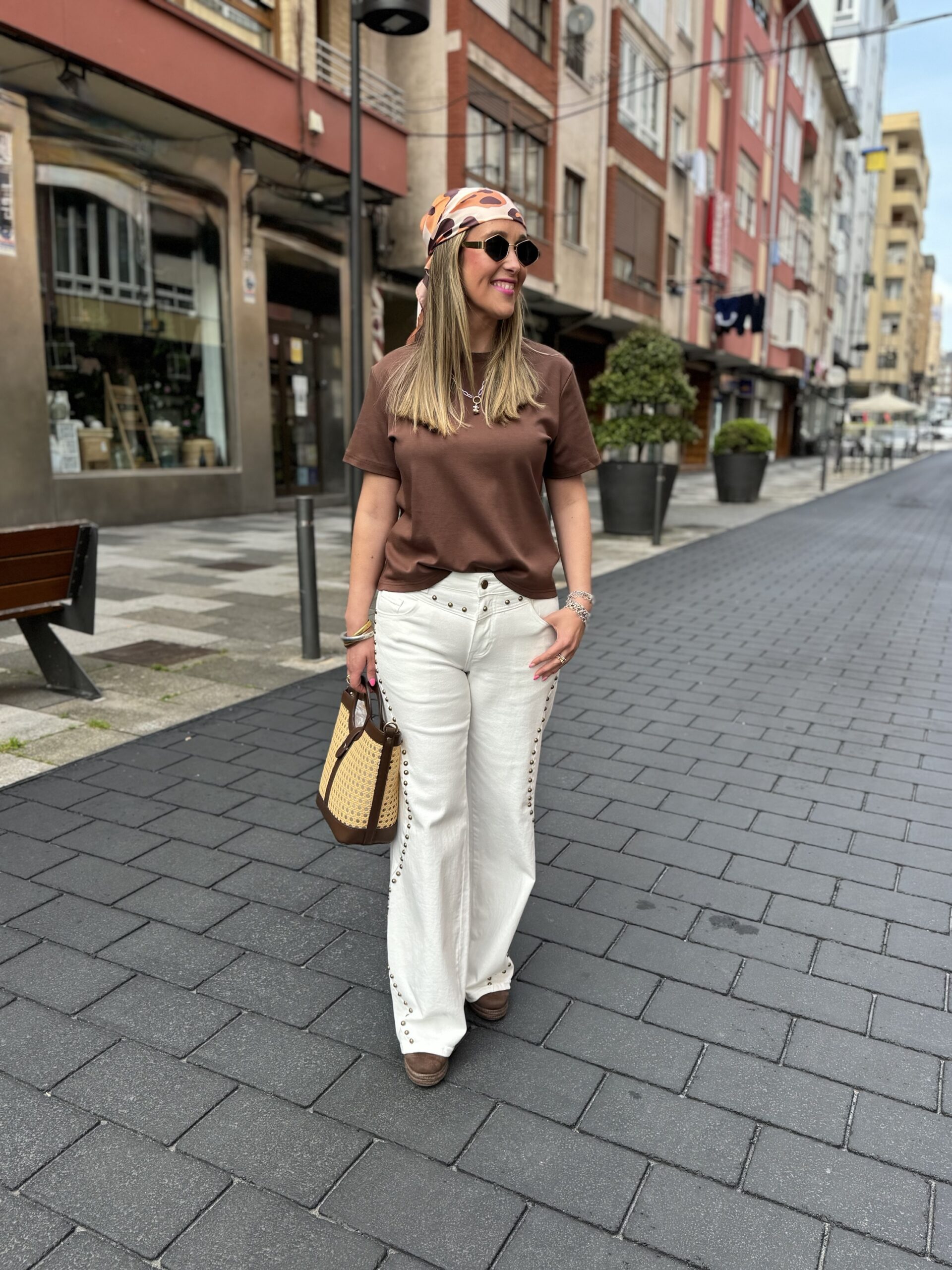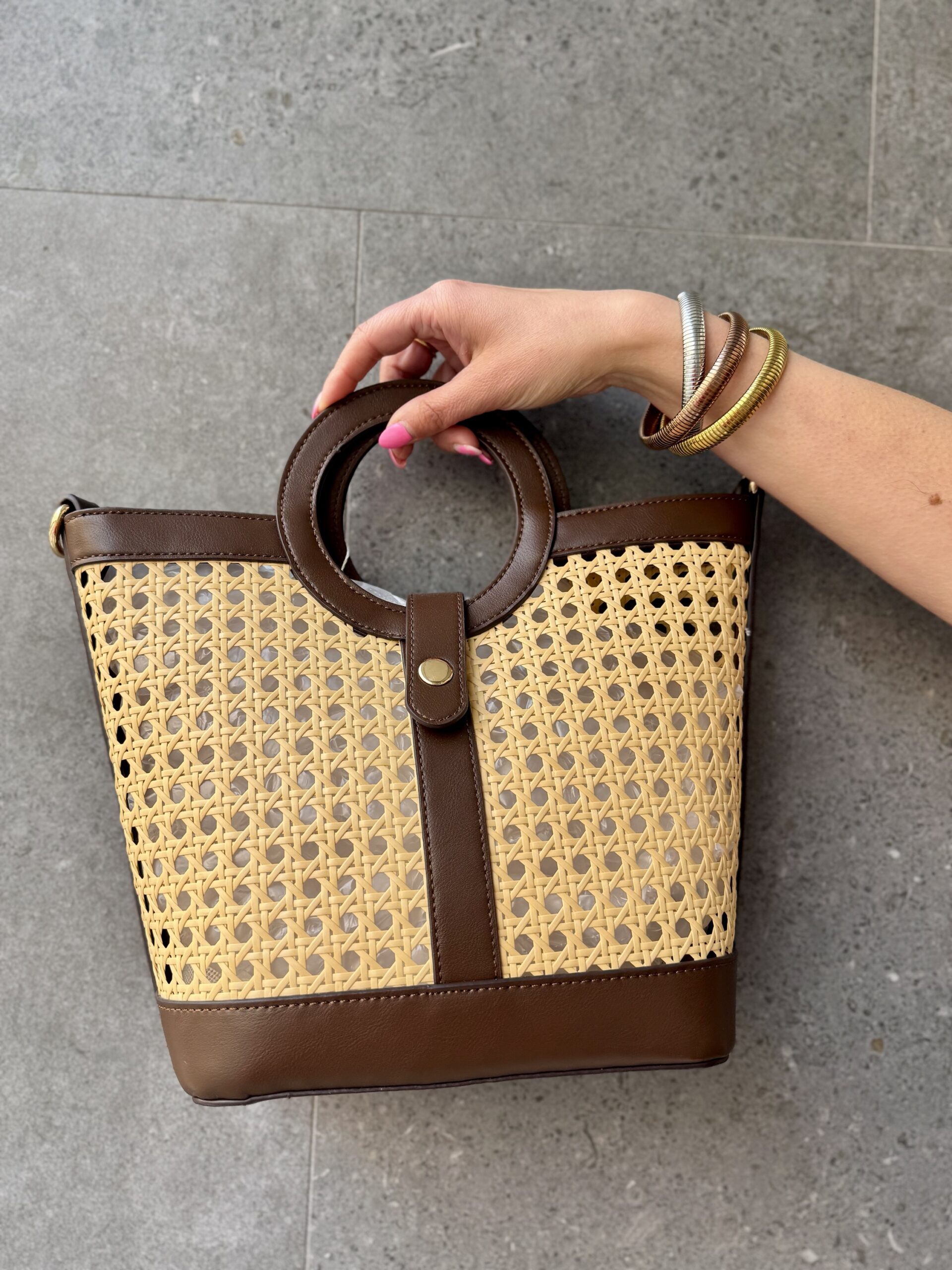 Bolso de rafia combinado en tono natural y marrón con asa rígida en forma circular que aporta un toque único y sofisticado. Perfecto para completar tus looks de verano con estilo. Tiene un neceser interior para poder meter más cosas .