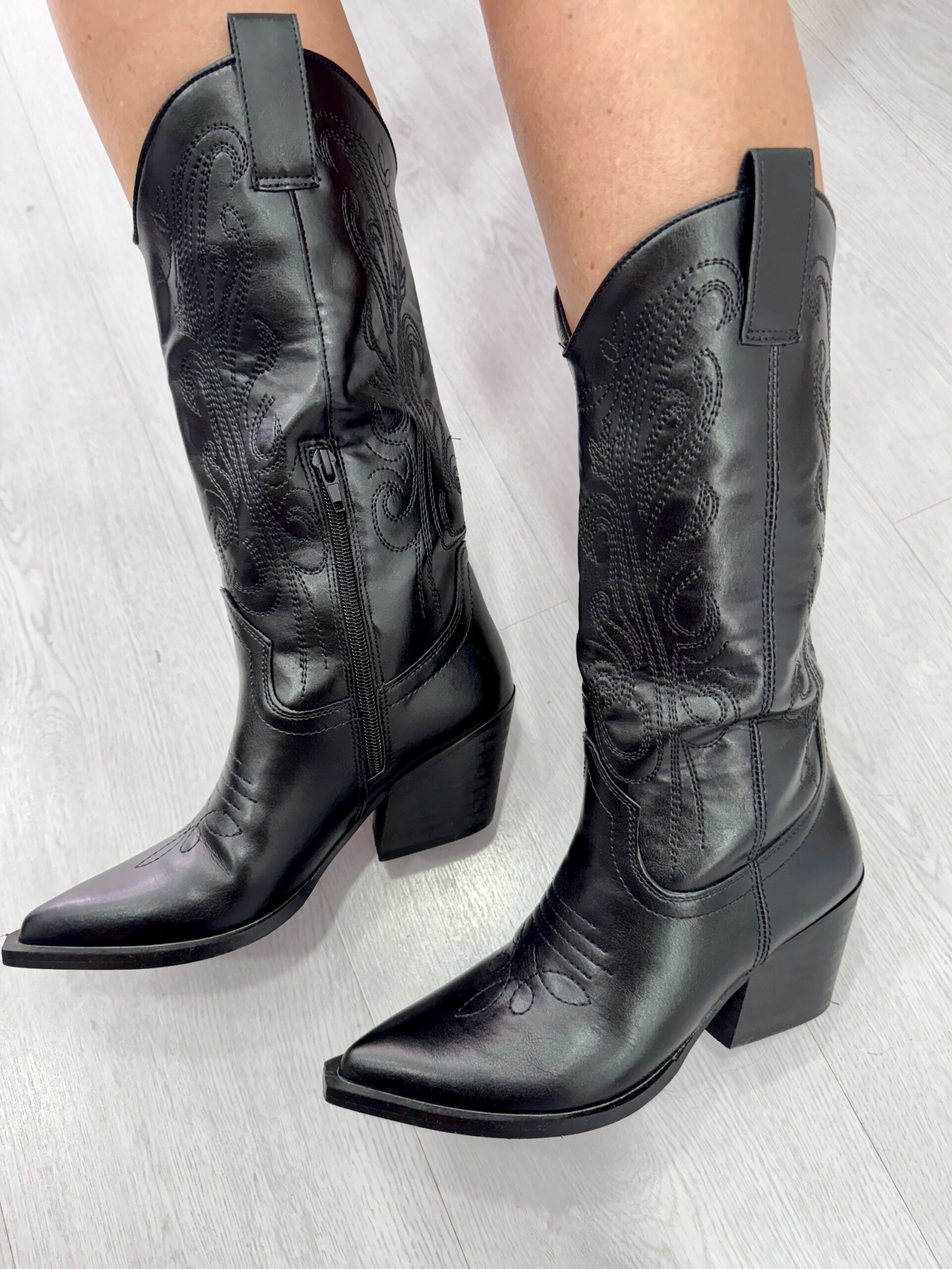 Bota campera en color negro en tejido de polipiel. Acabado en punto. Cremallera interna y tiradores para que sea más cómodo calzarnos.
