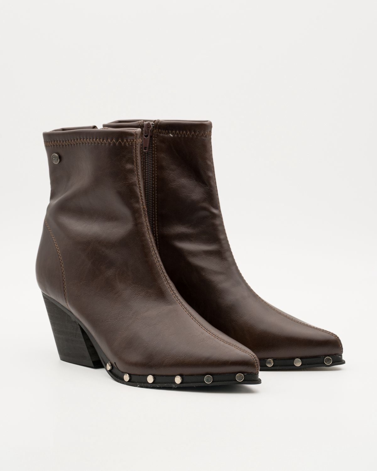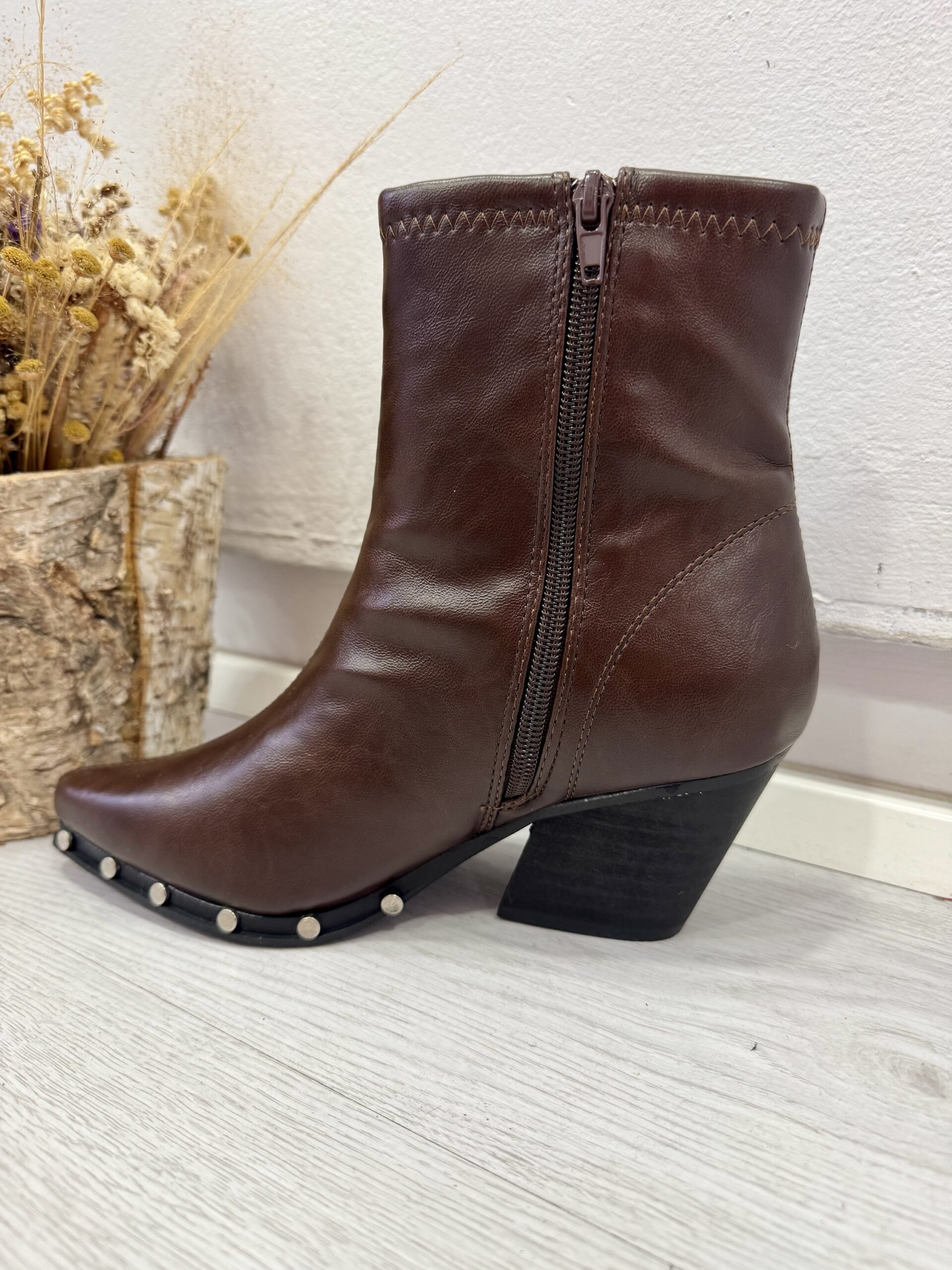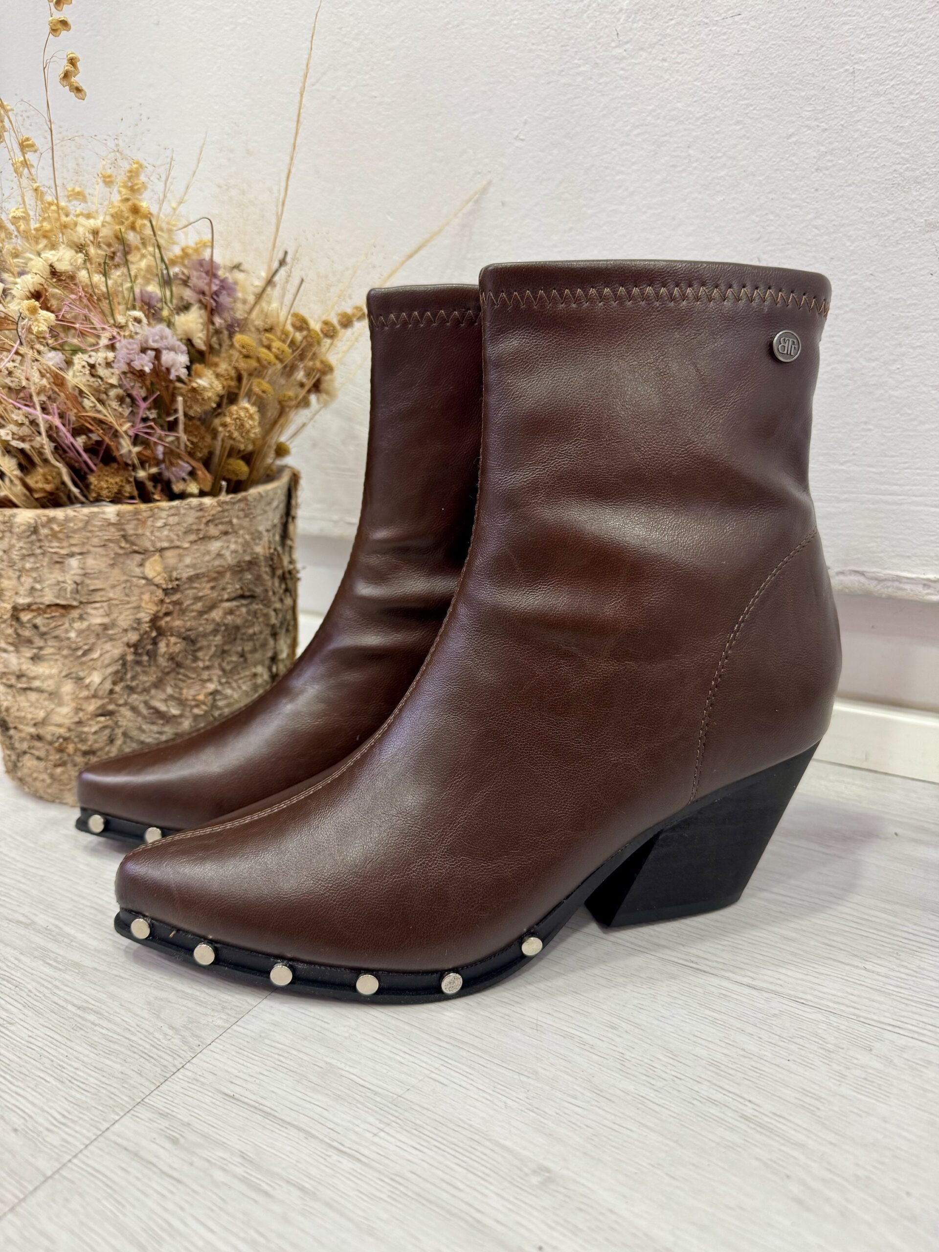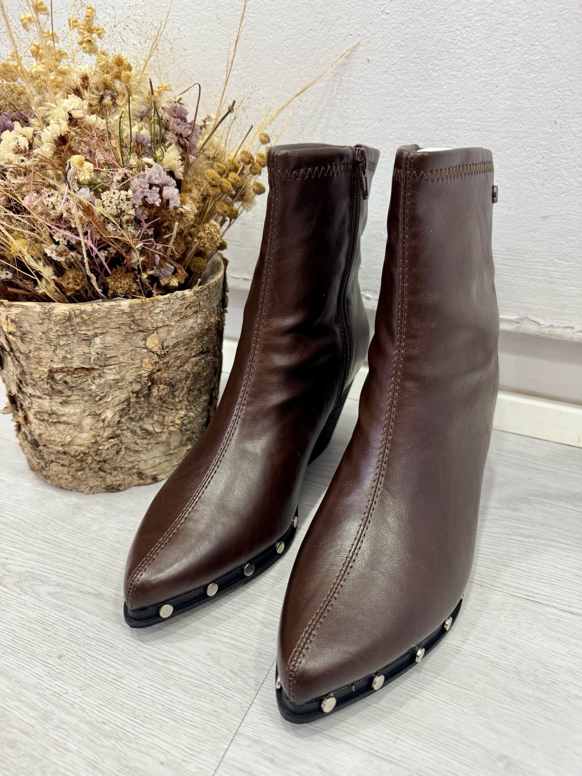 Botín tipo calcetín en color chocolate. Cremallera interna para que sea más cómodo calzarnos. Detalles de tachuelas a rededor