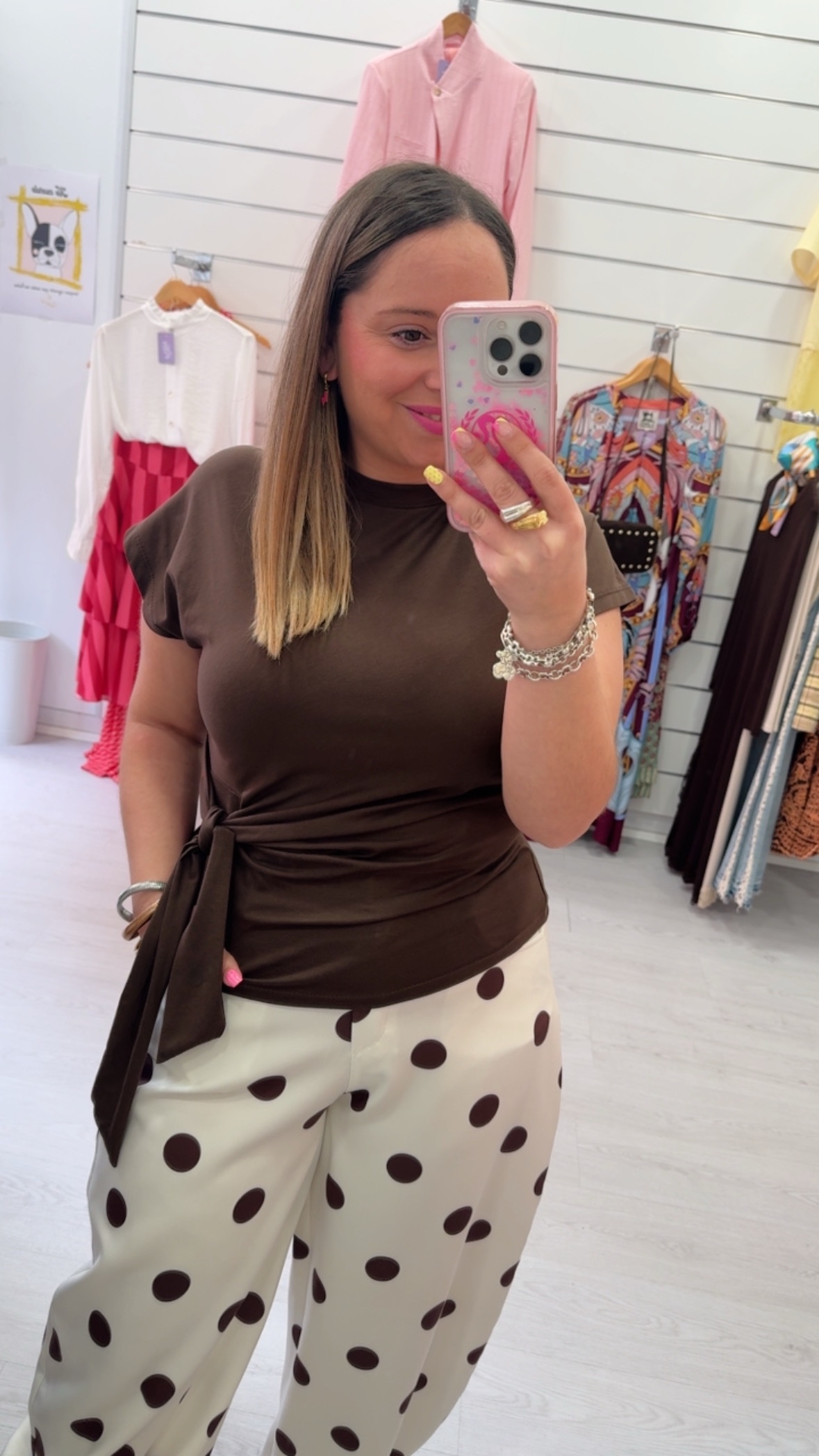 Camiseta de manga corta en color marrón chocolate. Detalle de lazada al costado.