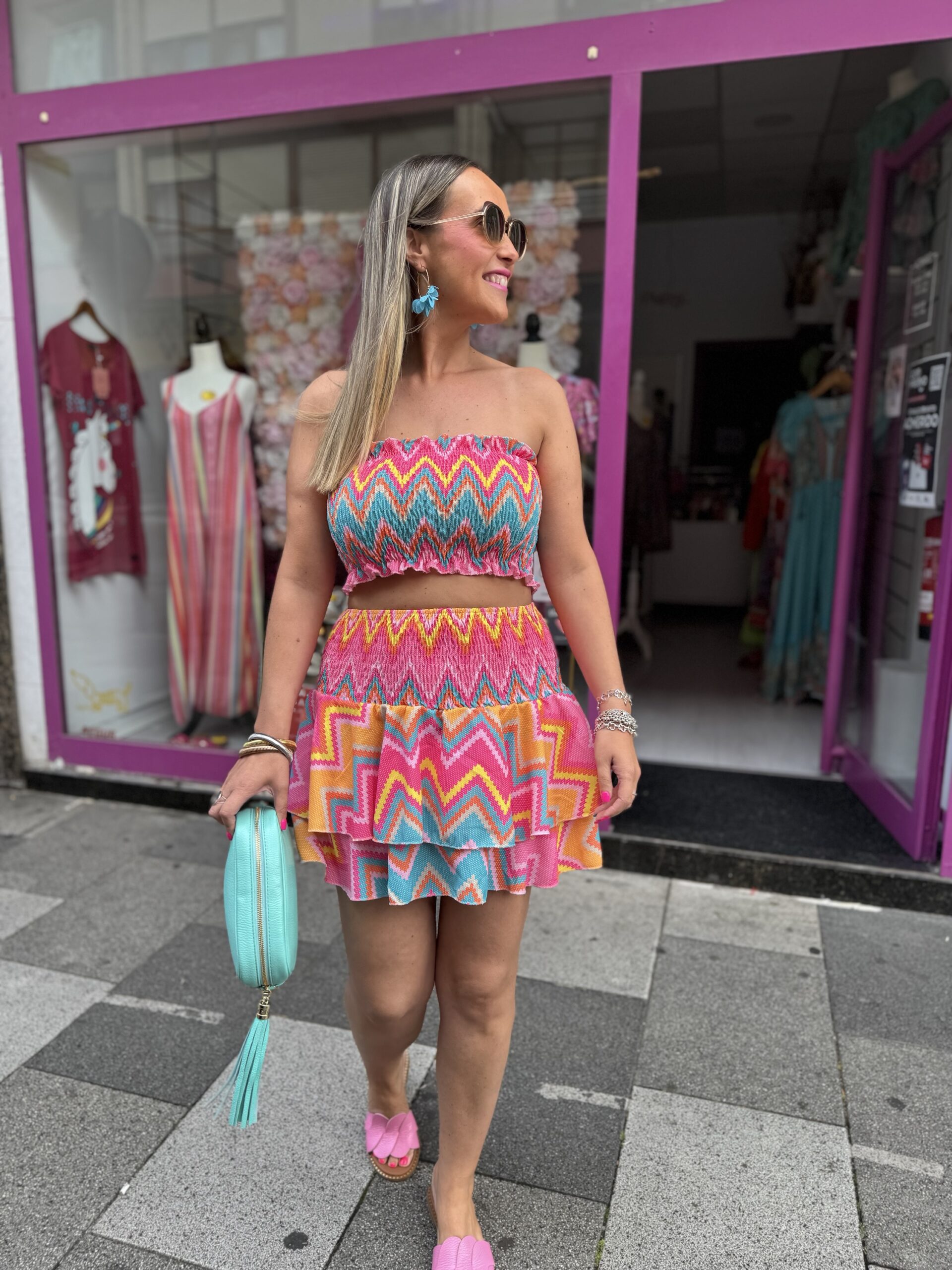 Conjunto de dos piezas formado por top y falda. Top engomado elástico y faldita en el mismo estampado con goma elástica en cintura.