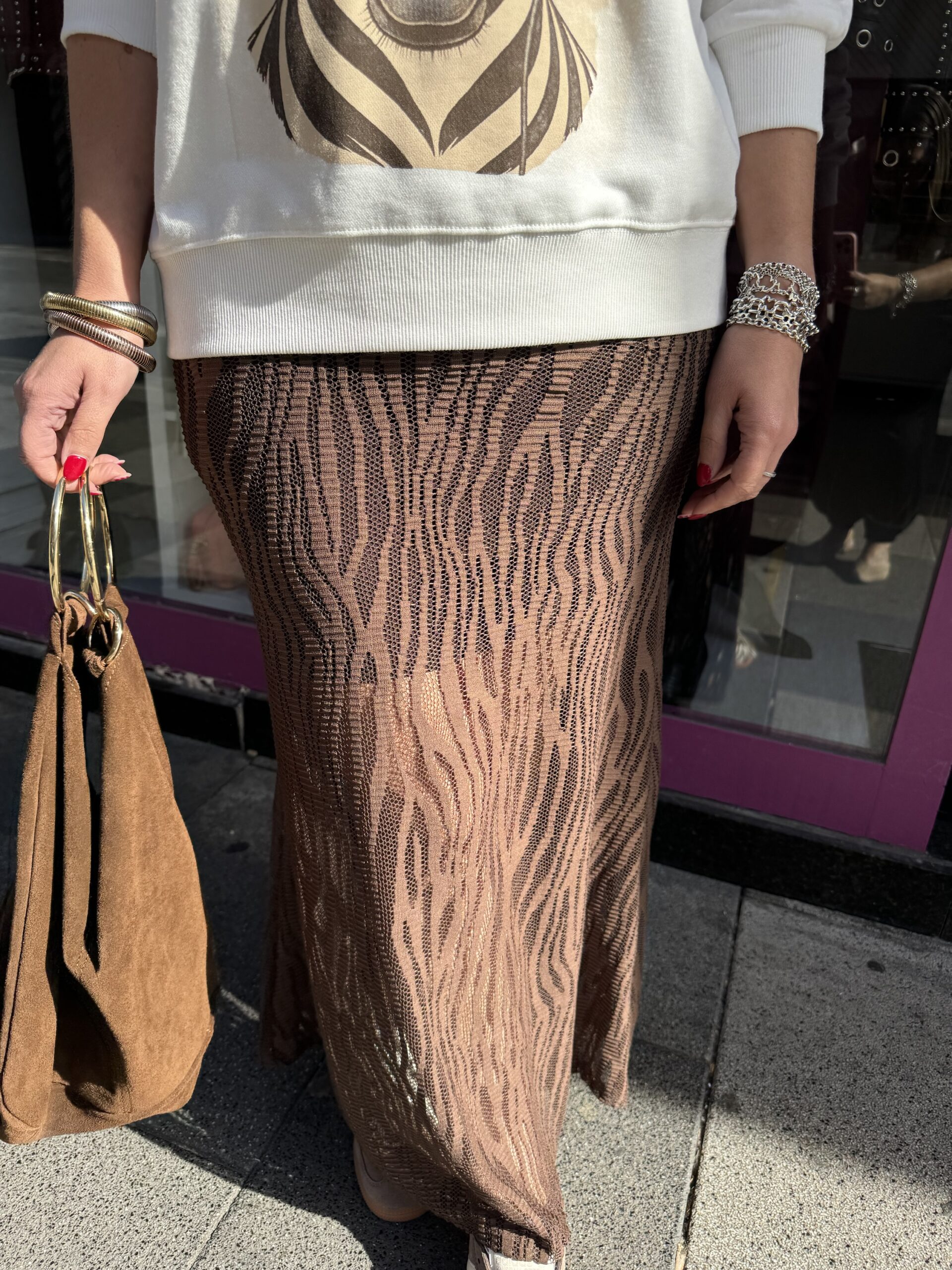 Falda en color marrón chocolate de encaje con dibujo lleva forro interior . Tiene goma elástica