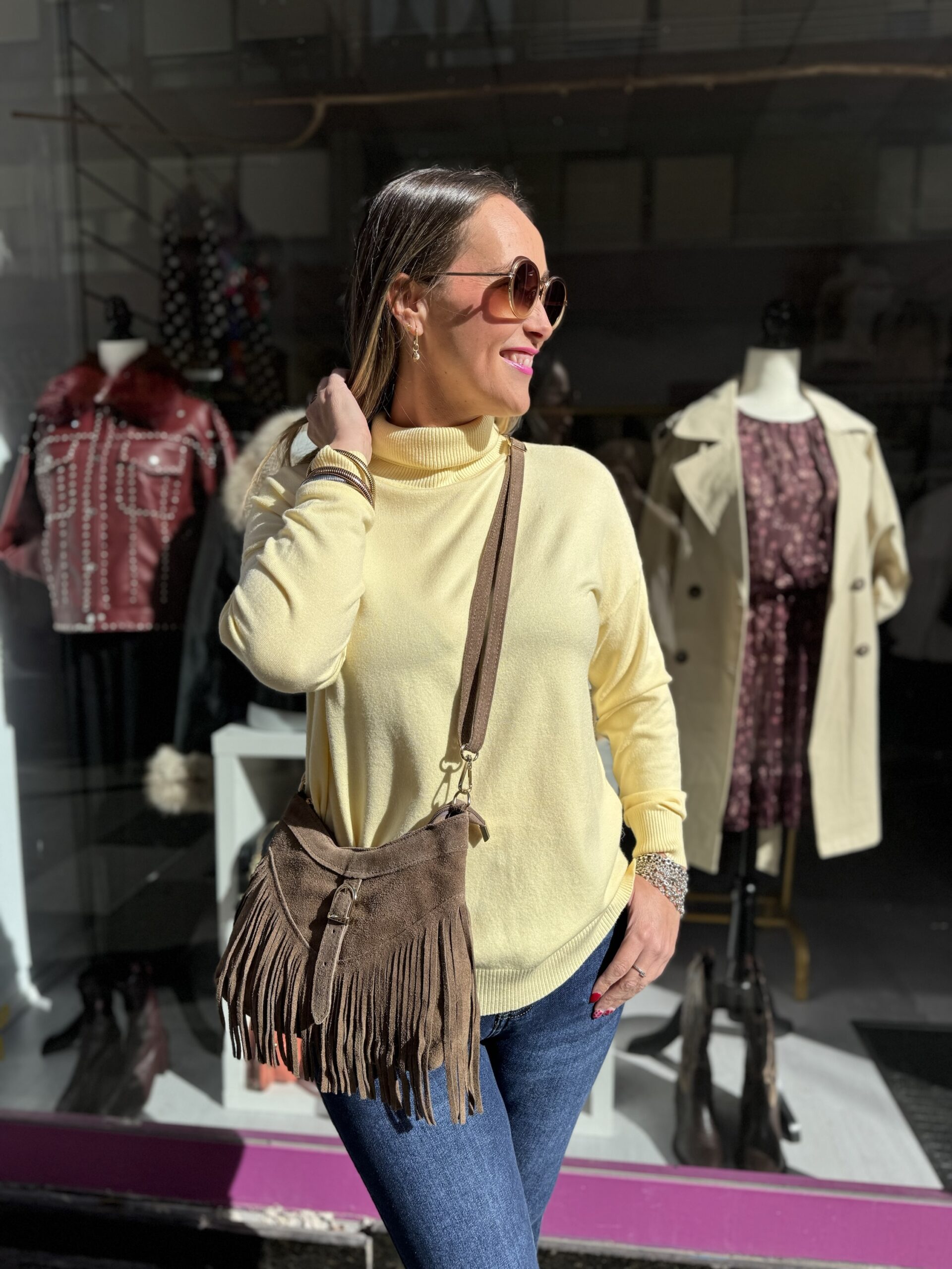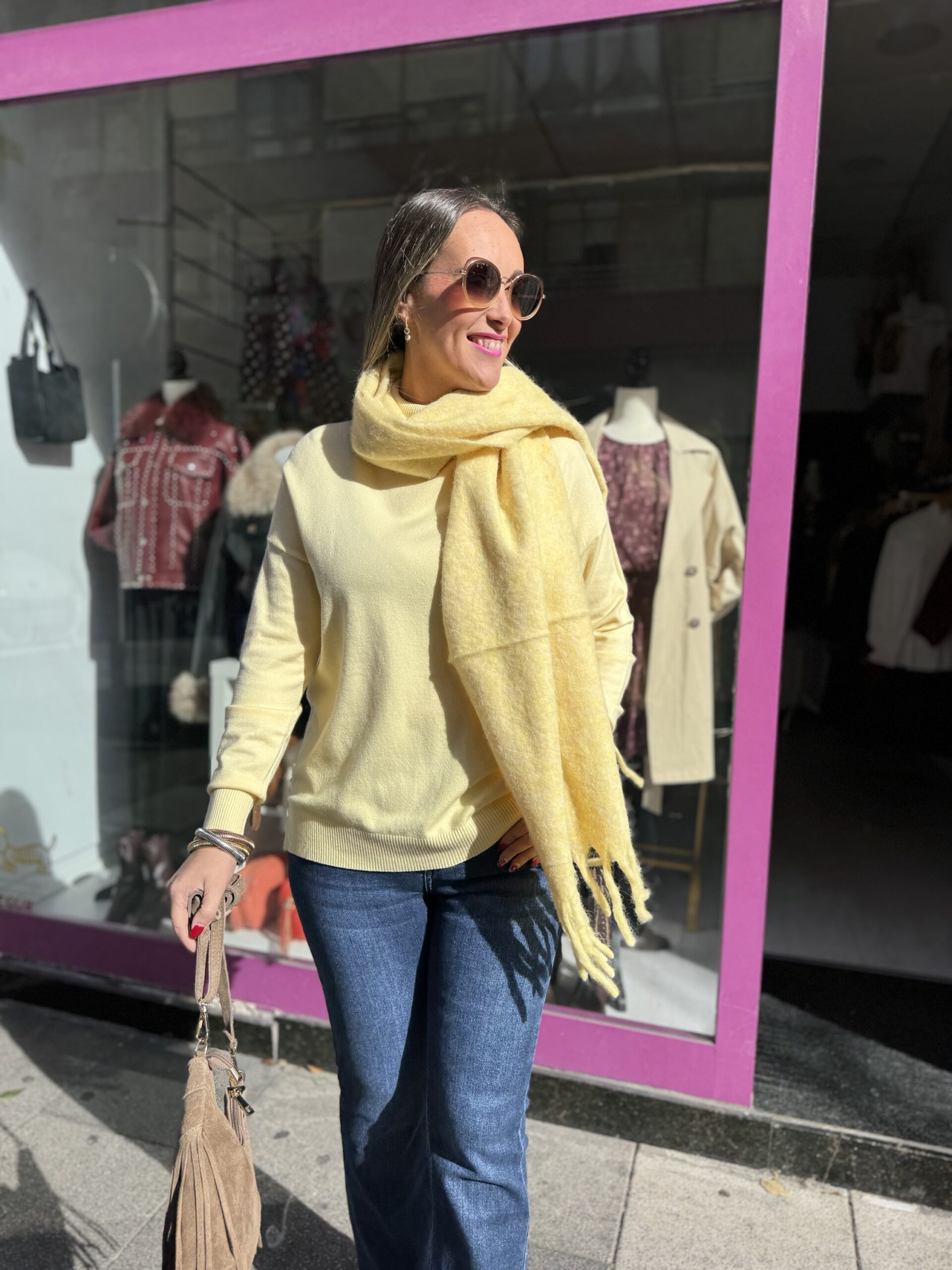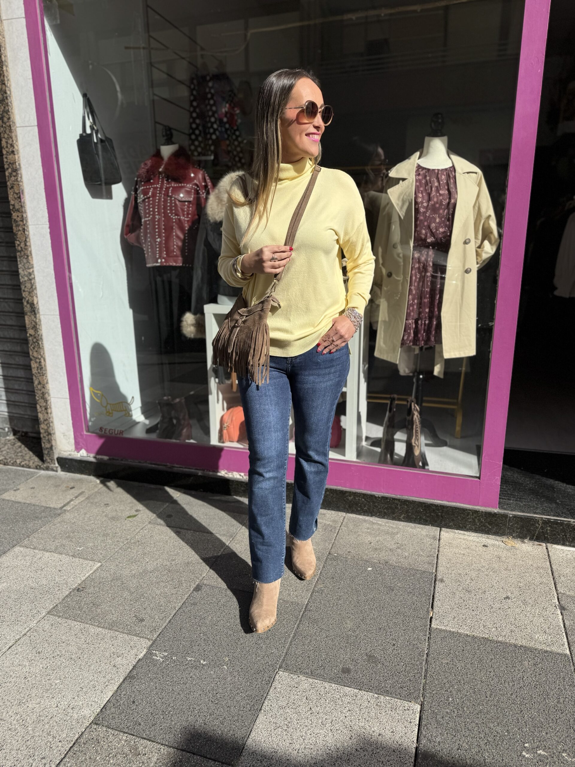 Jersey de punto extra suave en color amarillo pastel. Cuello alto .