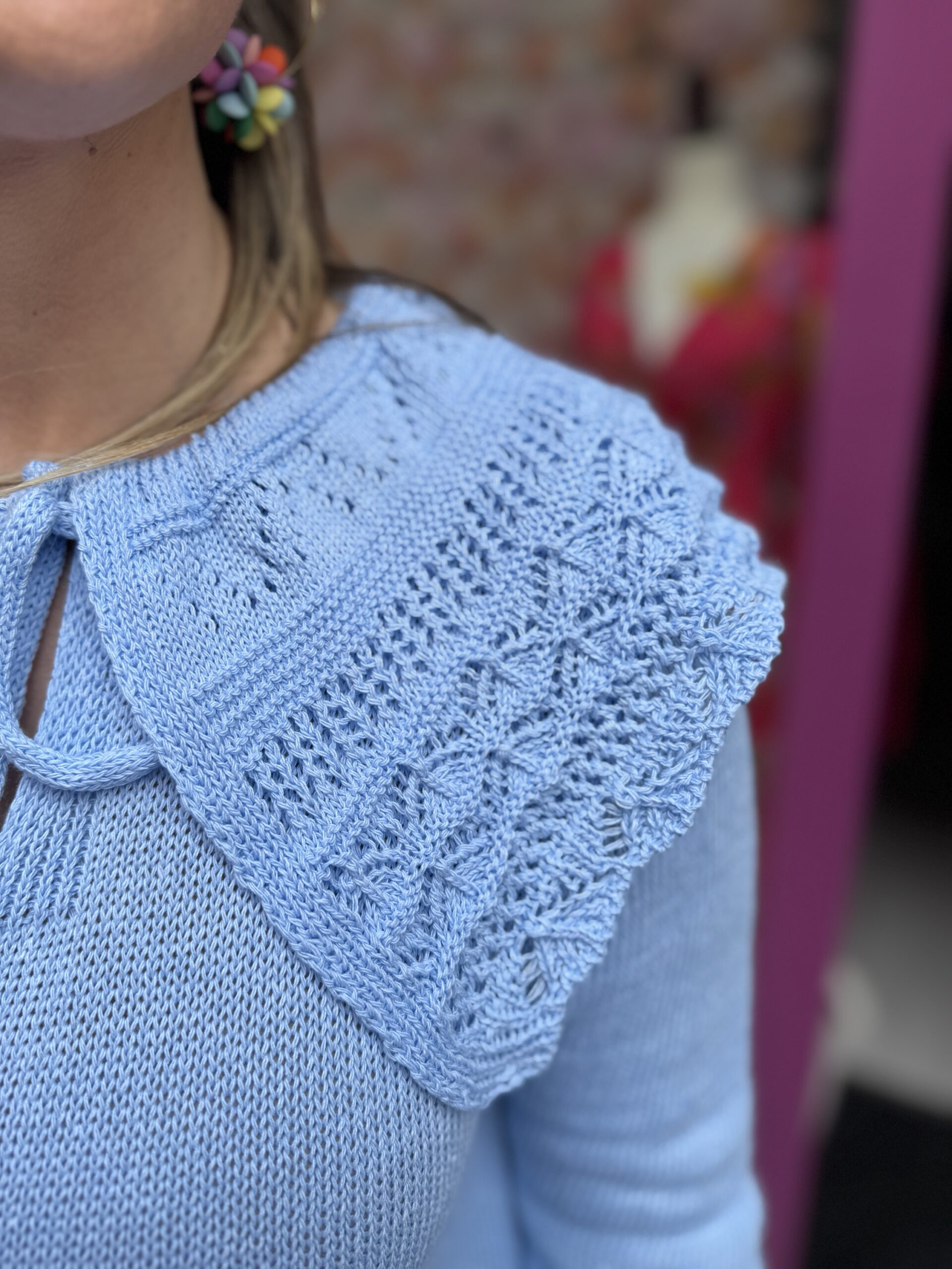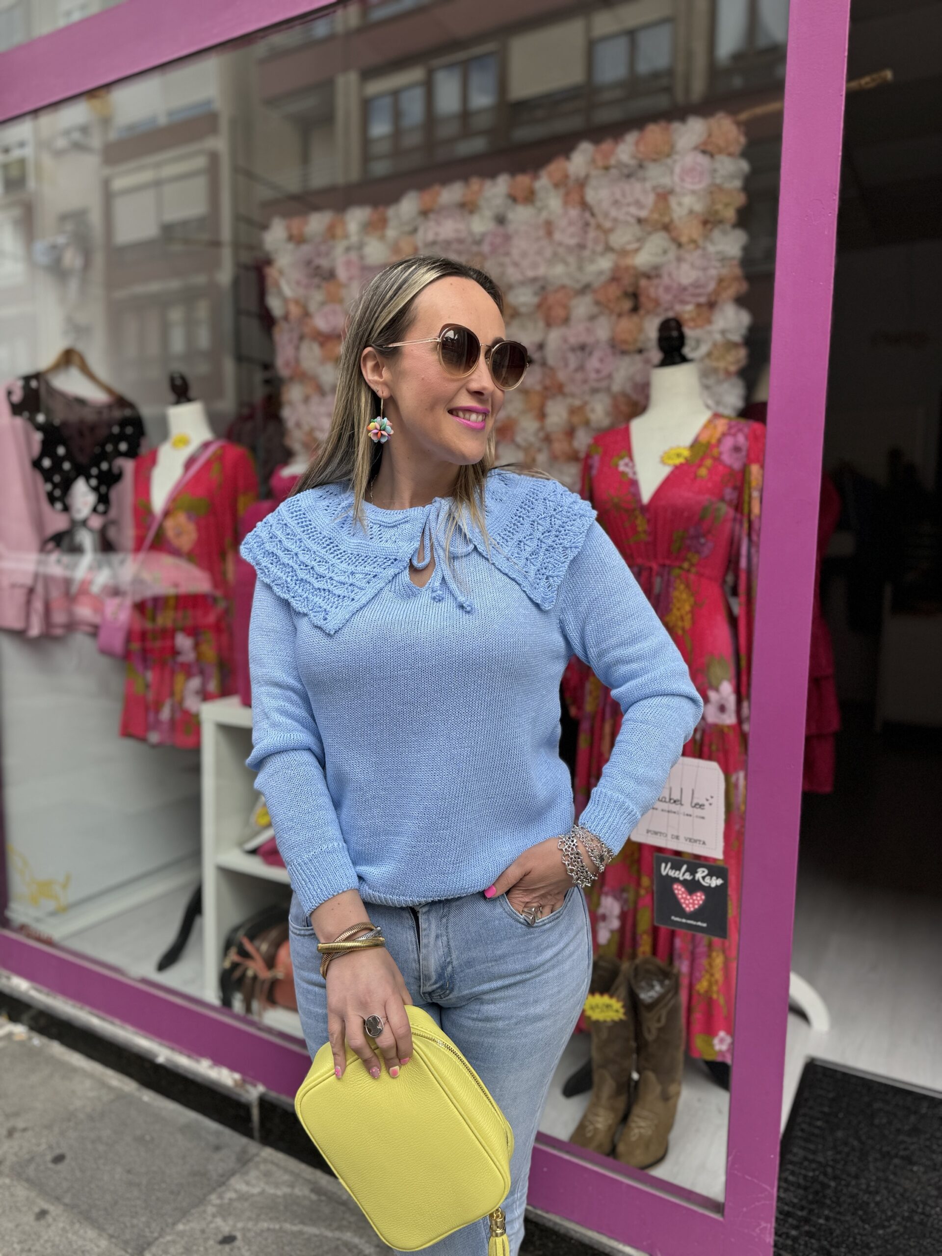 Jersey de punto fino en color azul . Es de manga larga , detalle de cuello bebé .