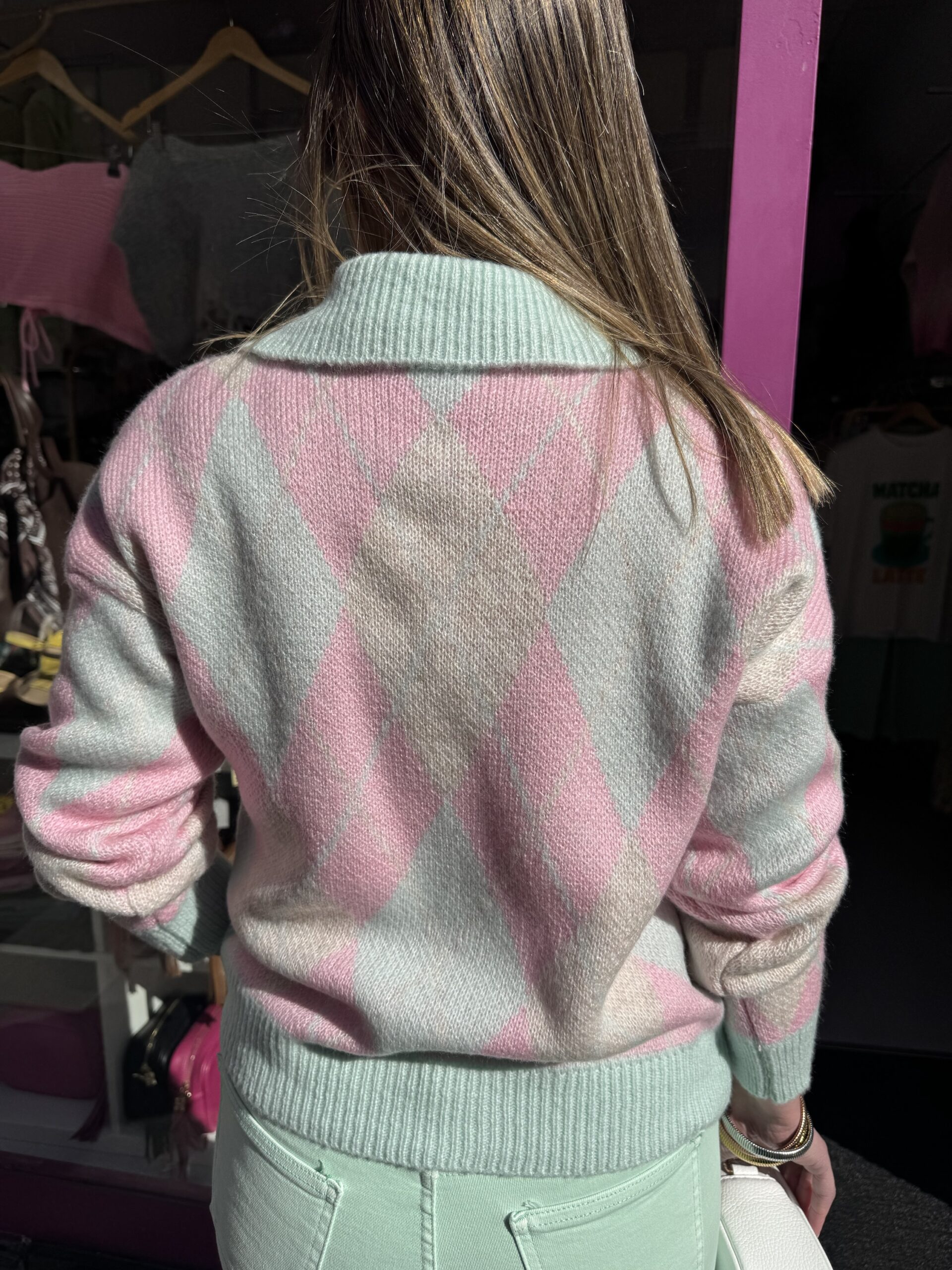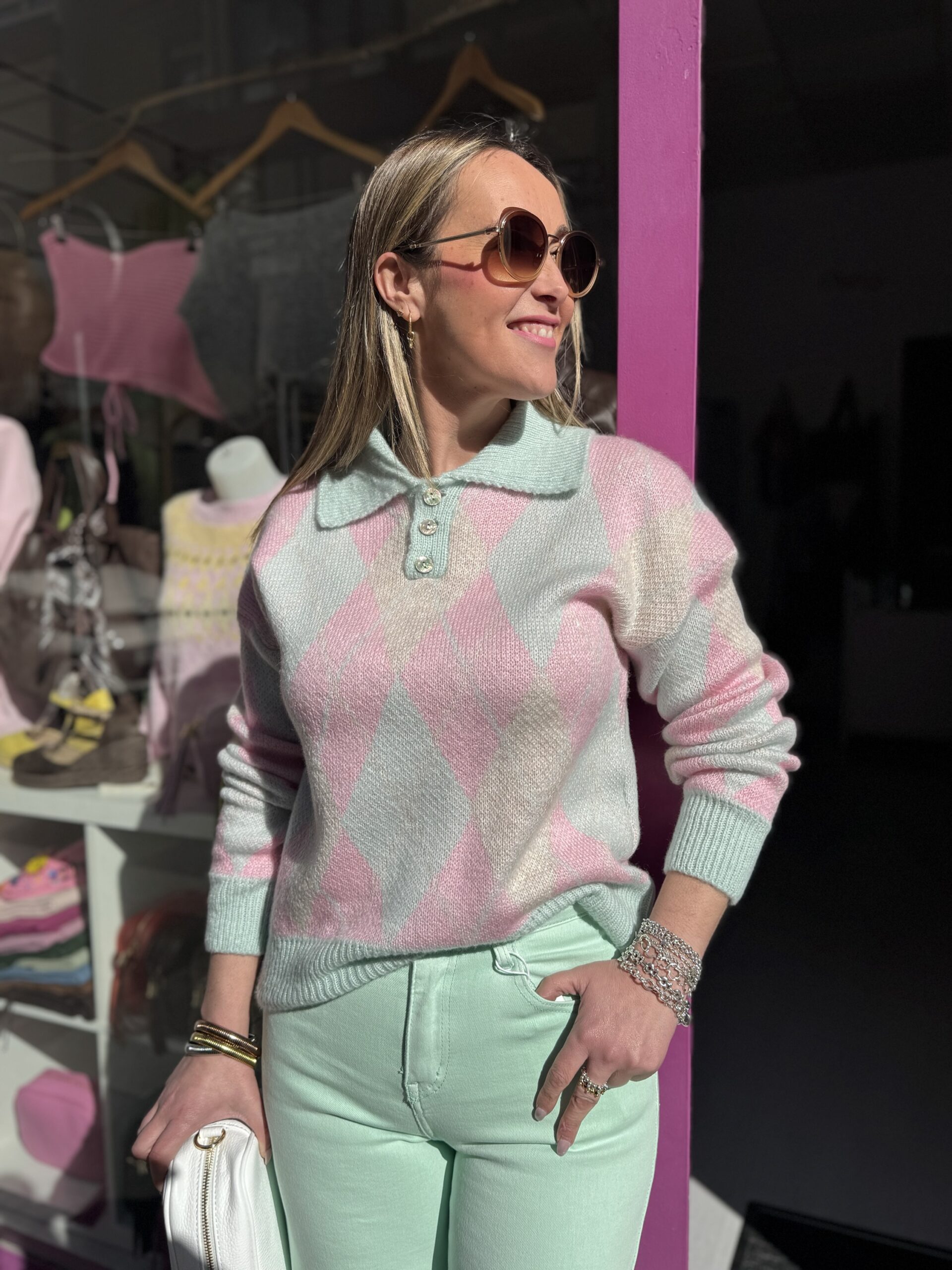 Jersey de punto suave con estampado de rombos en tonos pastel. Su diseño con cuello polo y botones joya aporta un aire especial y muy femenino. Una prenda cómoda y luminosa, perfecta para dar color a tus looks diarios y combinar fácilmente con denim o tonos claros.
