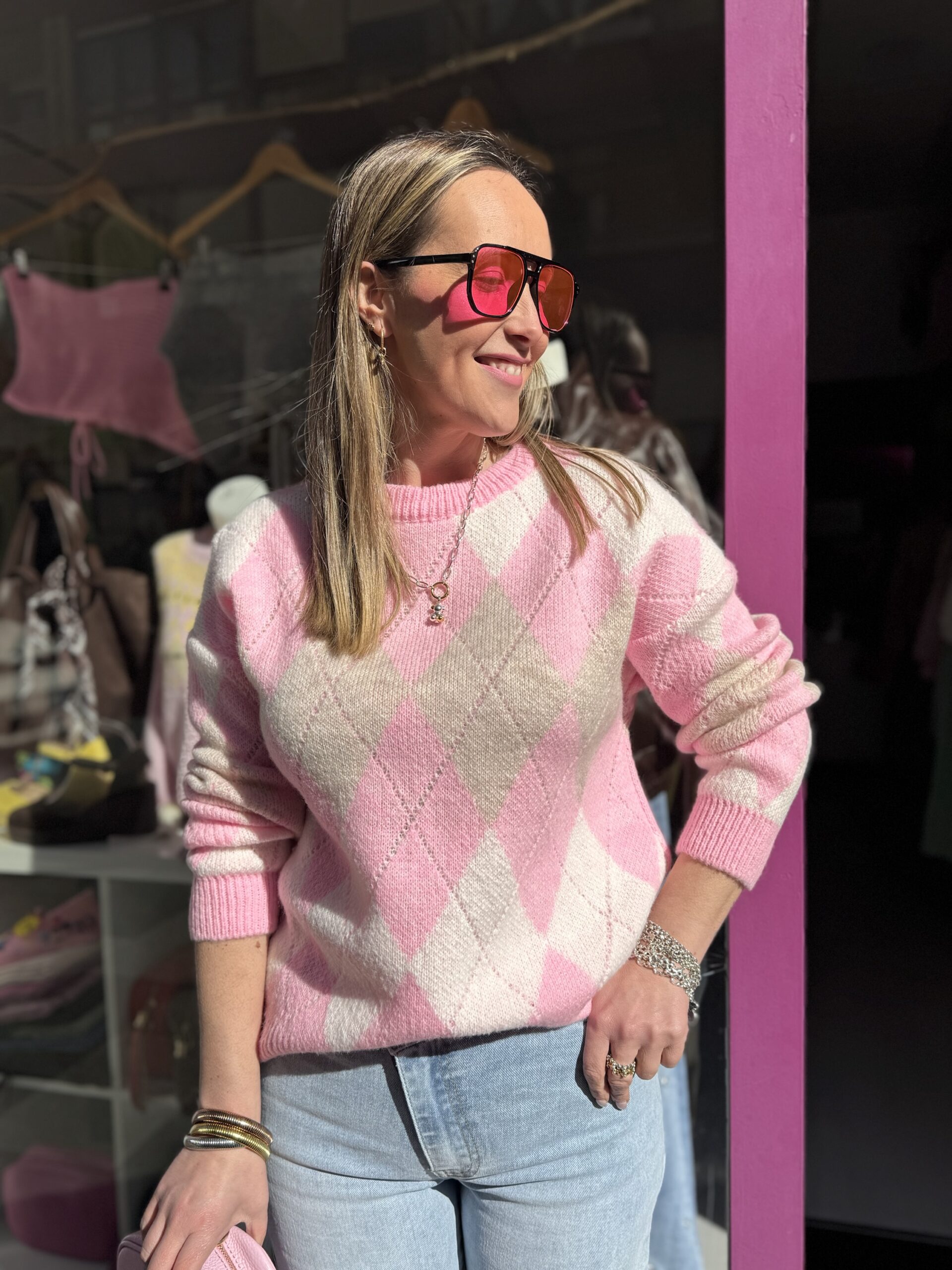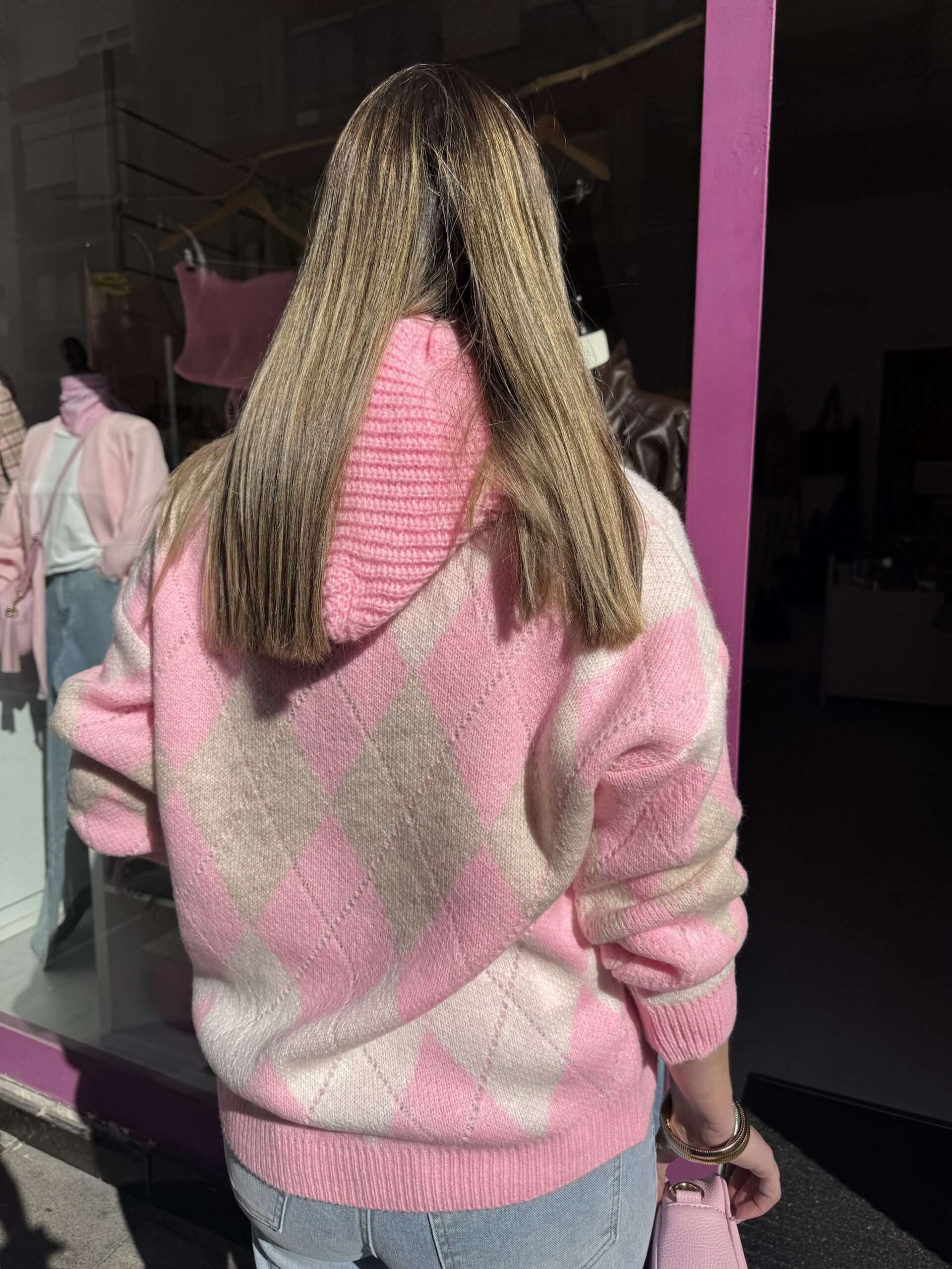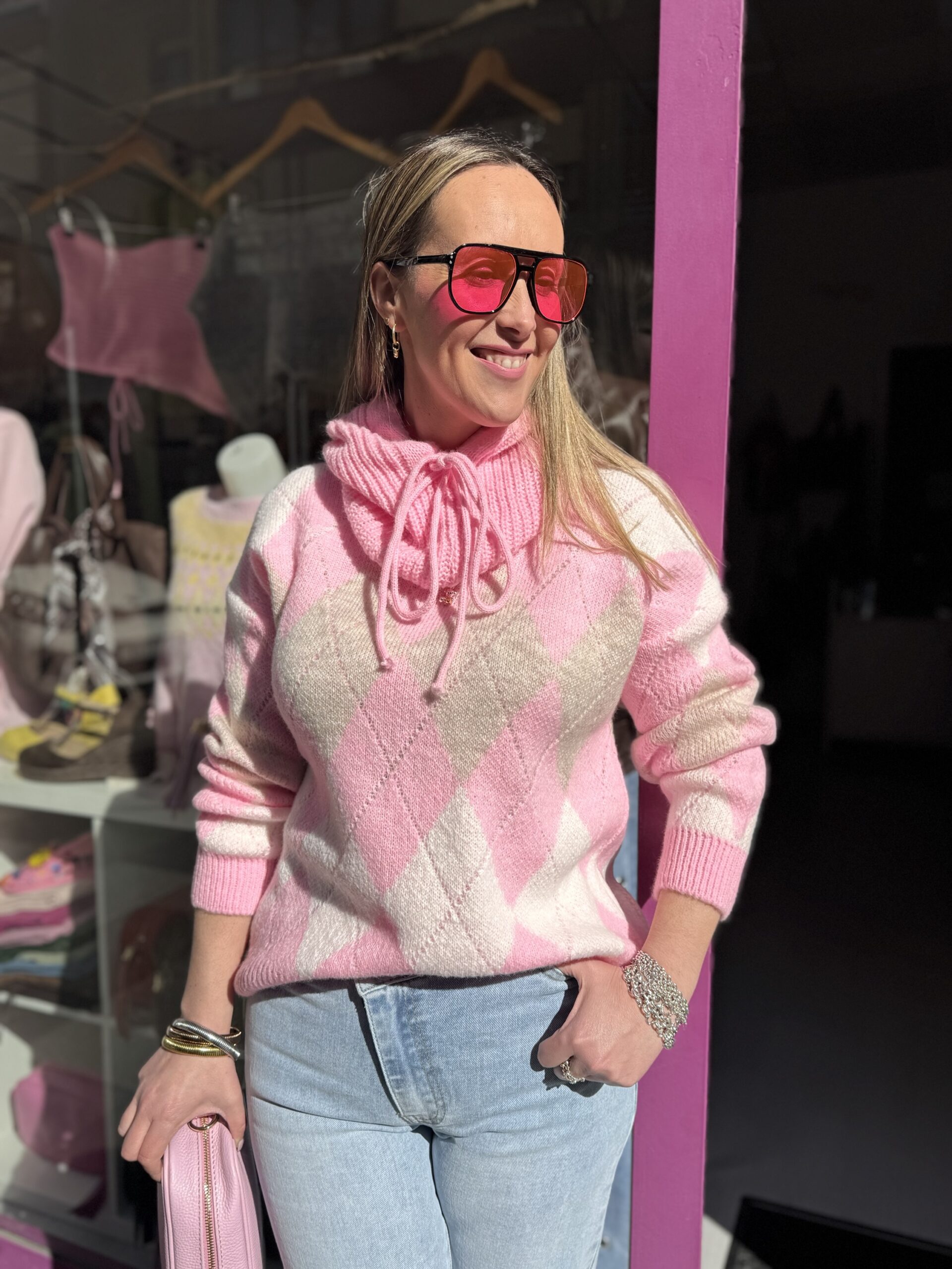 Nuestro Jersey Pink Diamonds es una de esas prendas especiales que elevan cualquier look sin esfuerzo. Su bonito estampado de rombos en tonos rosa y beige aporta luz y un toque muy dulce, perfecto para la nueva temporada.