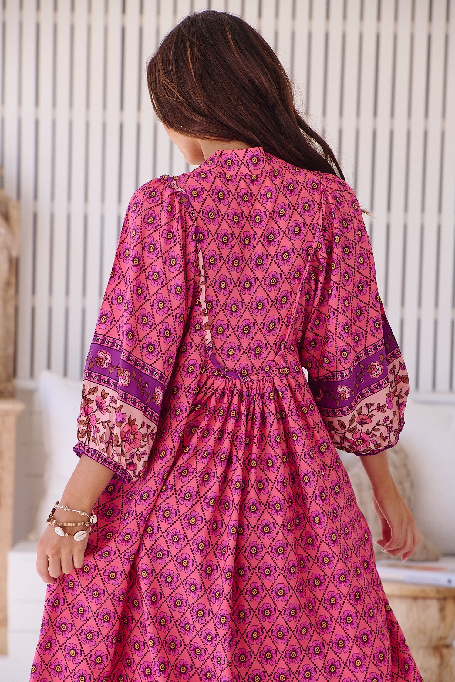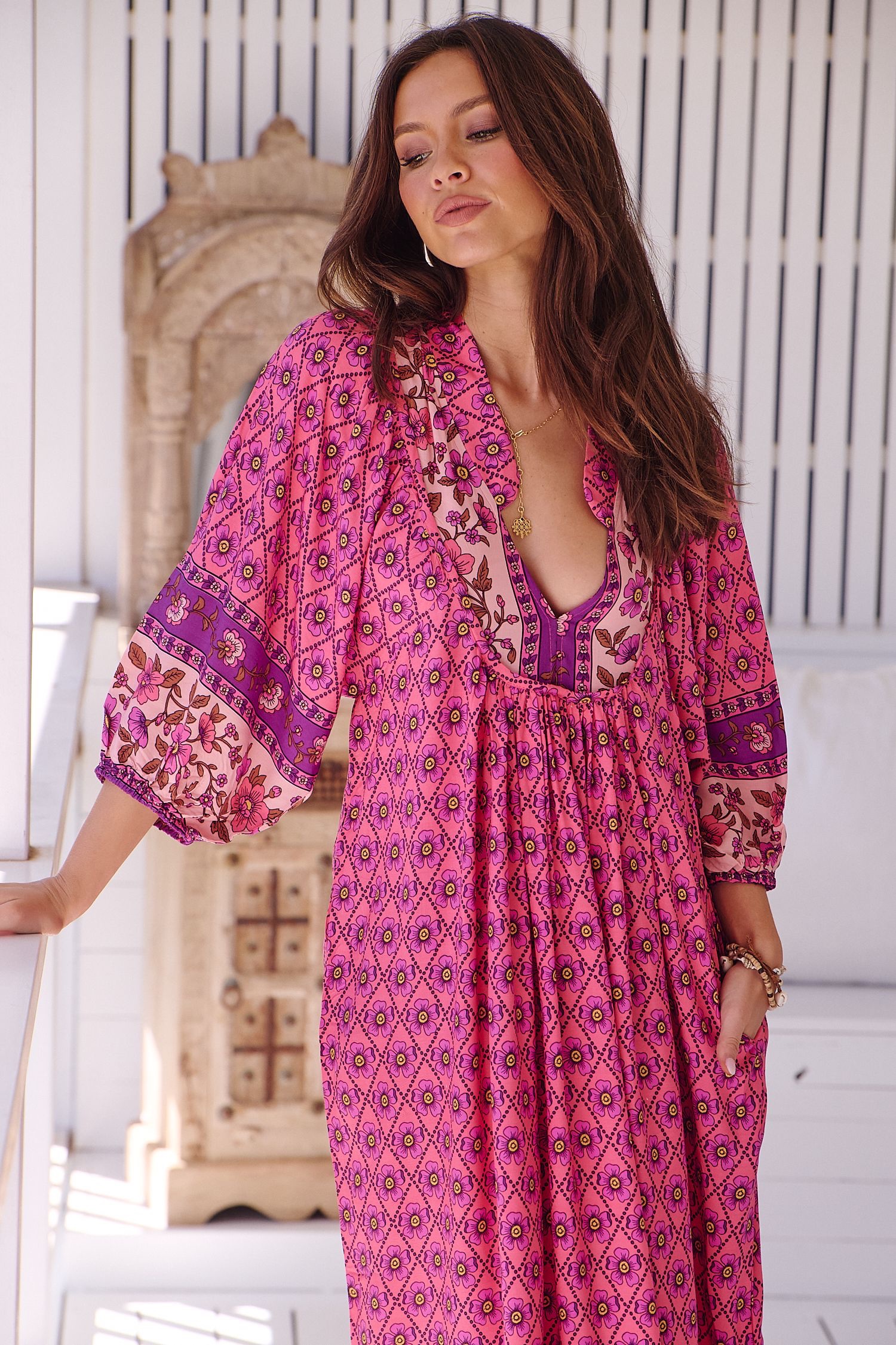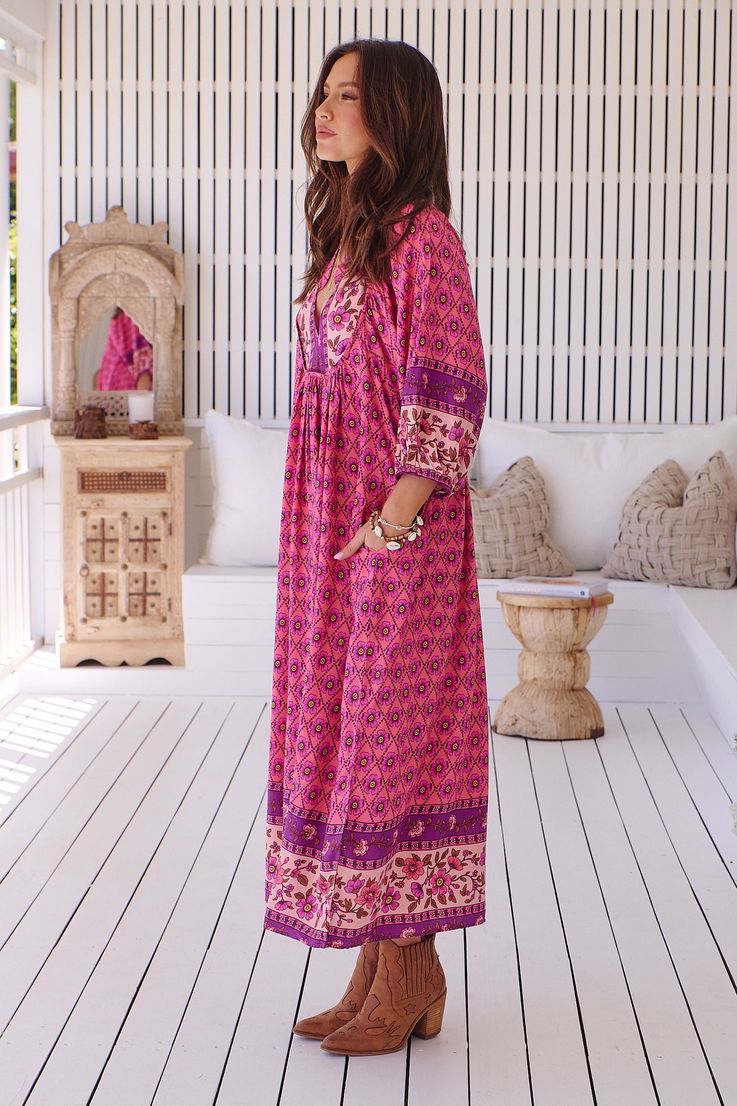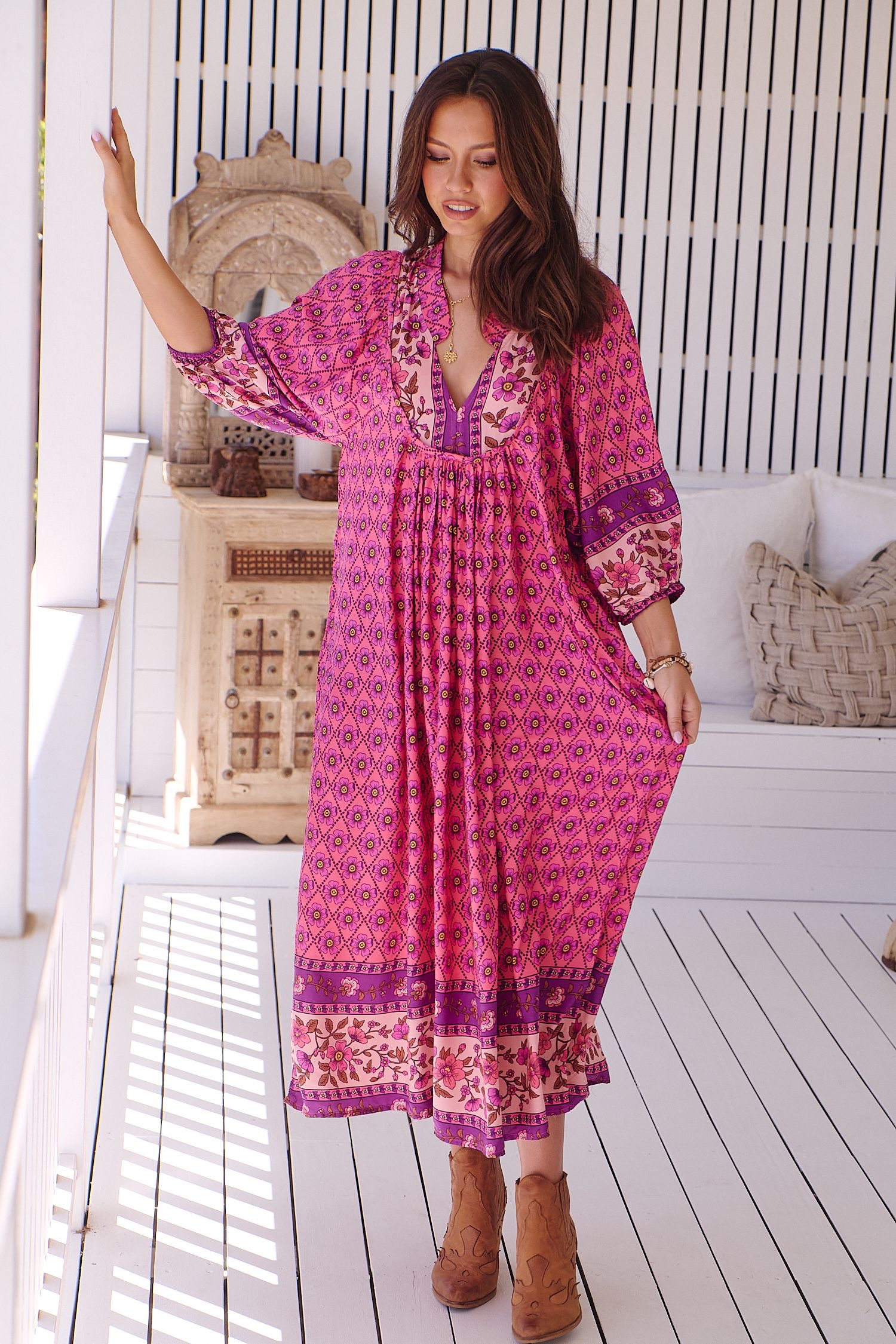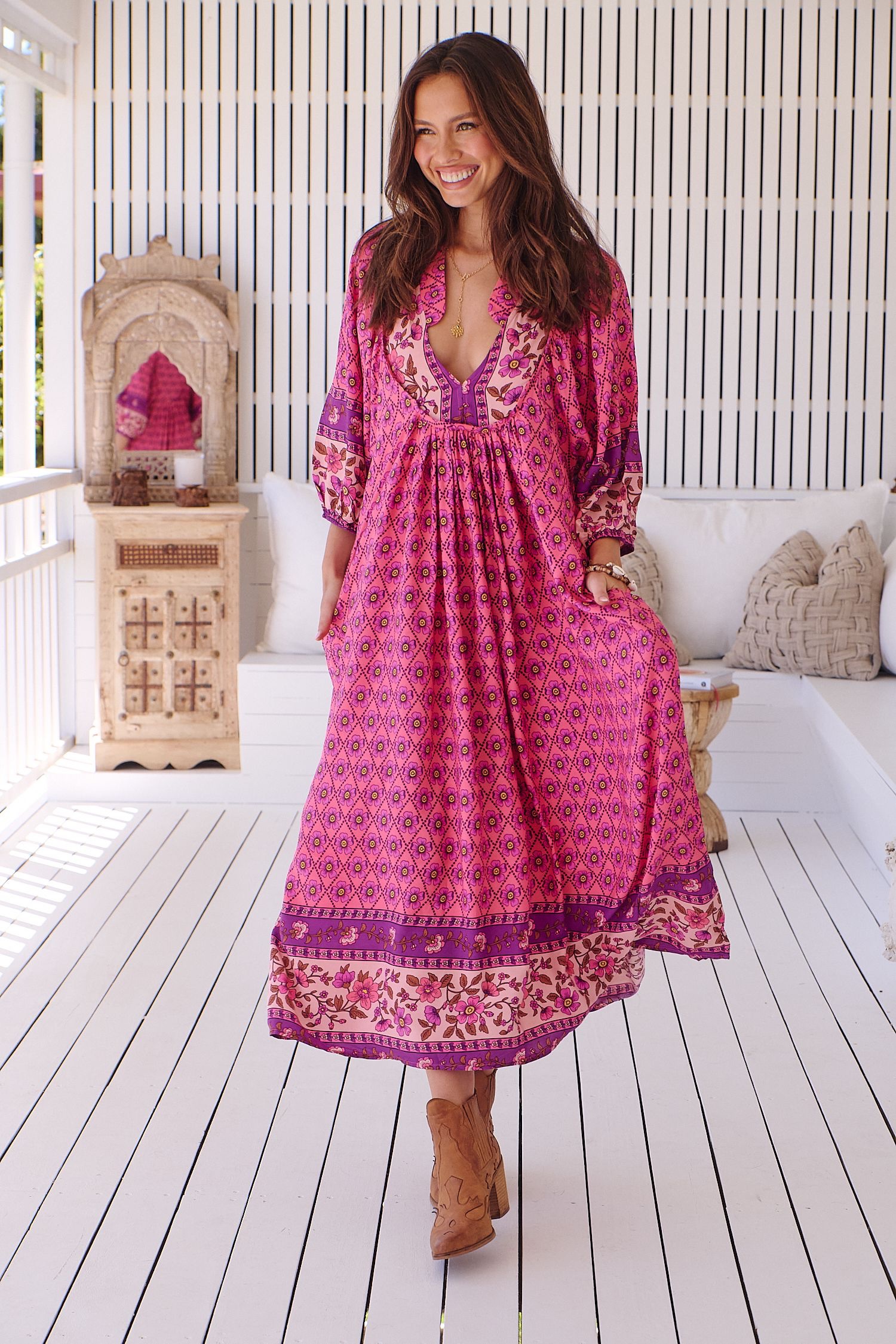 Vestido midi de la firma australiana JAASE. Escote en pico, y corte ligeramente oversice. Tiene bolsillos laterales.