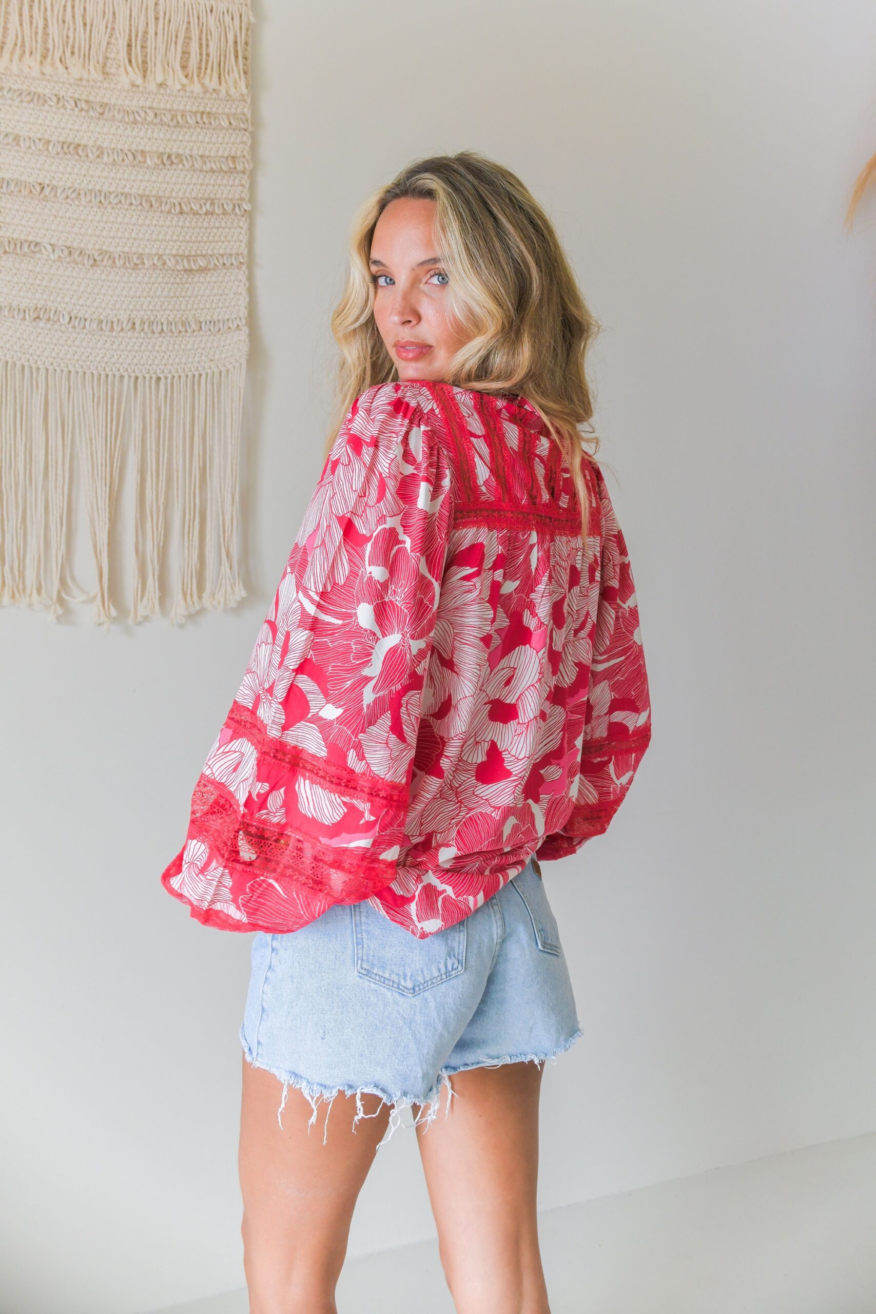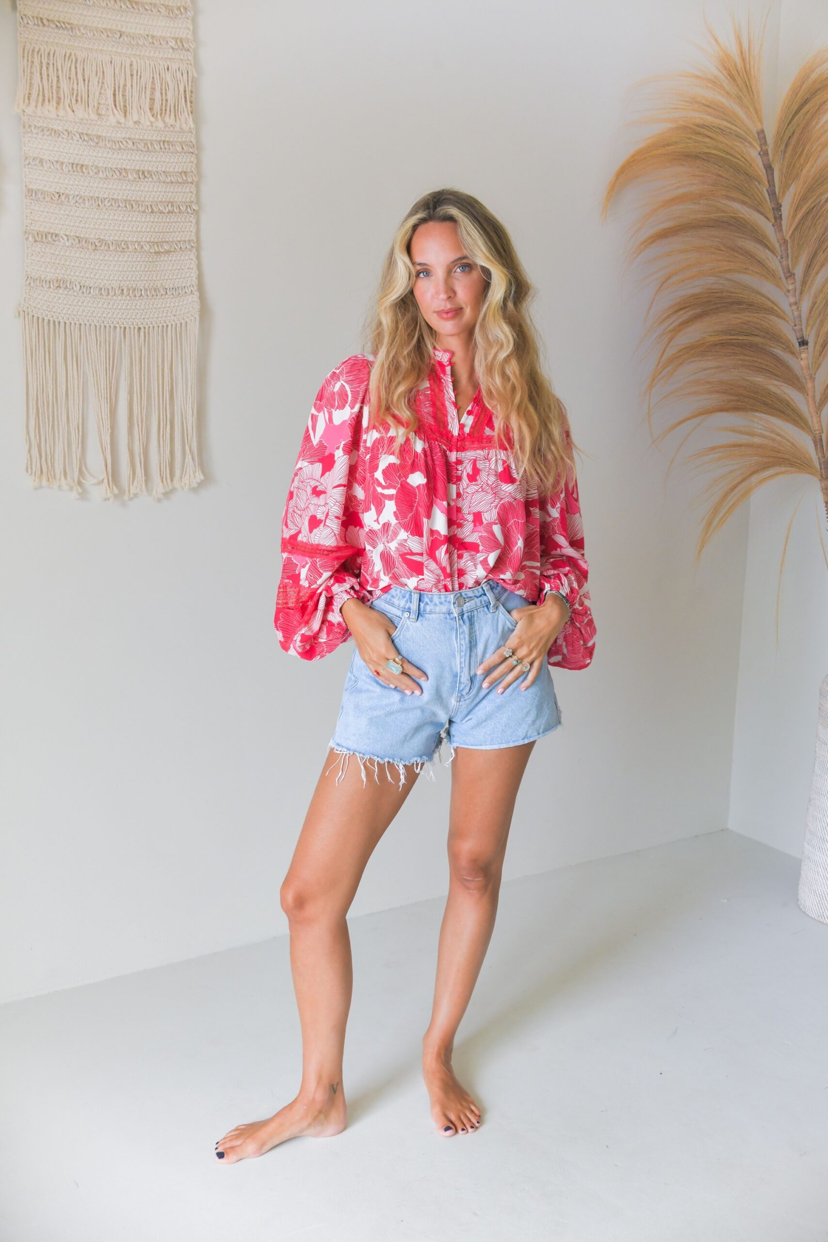 Blusa de la firma australiana JAASE con un diseño irresistible y muy favorecedor. Su estampado floral en tono frambuesa aporta luz y frescura, convirtiéndola en una prenda especial que eleva cualquier look sin esfuerzo.