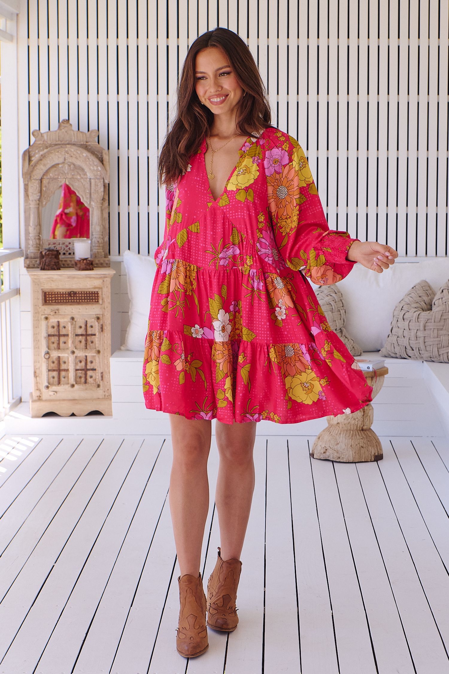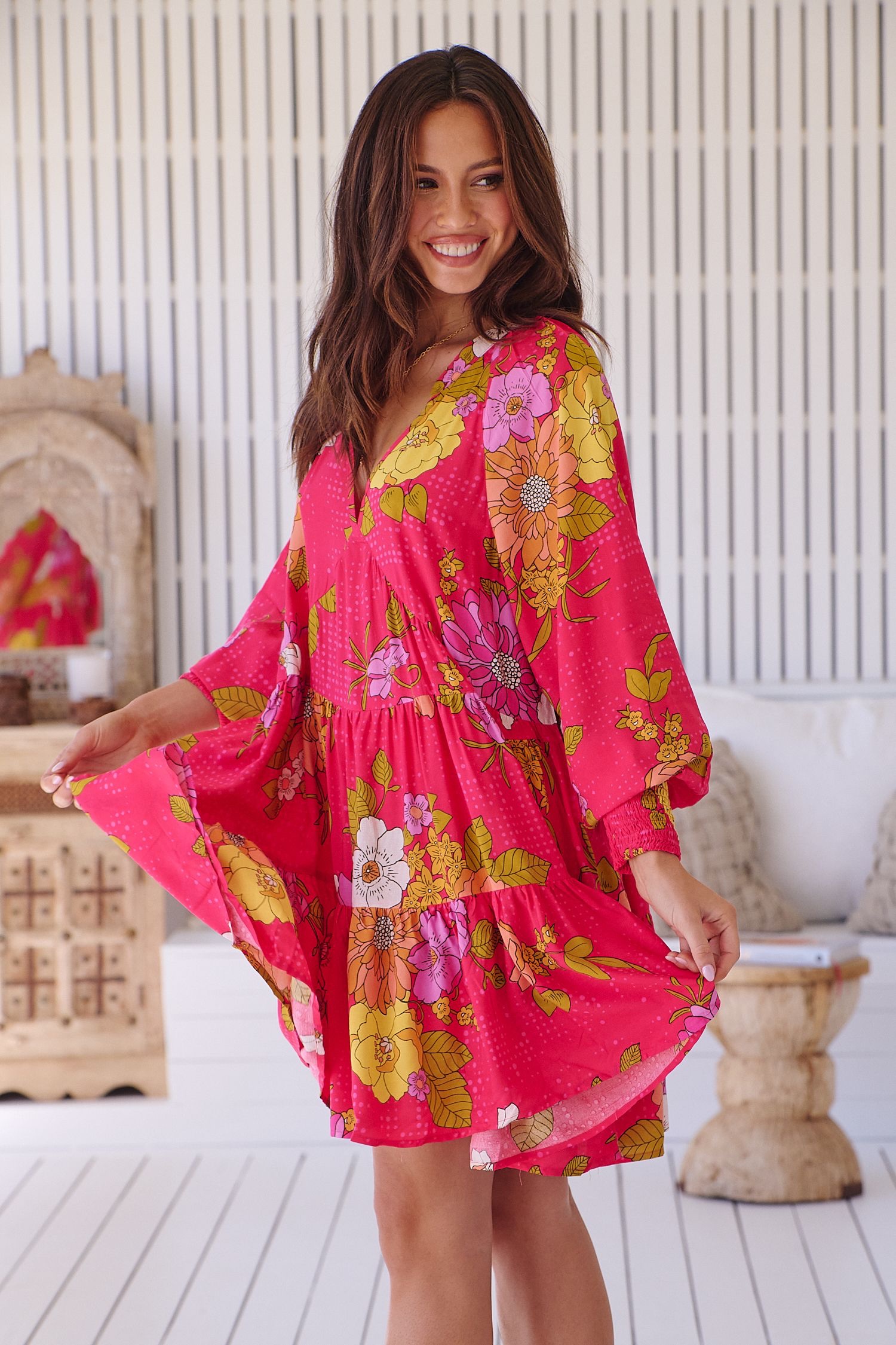 Vestido corto de estilo Boho de la firma australiana JAASE. Escote en pico, este patrón estilo bastante amplio.