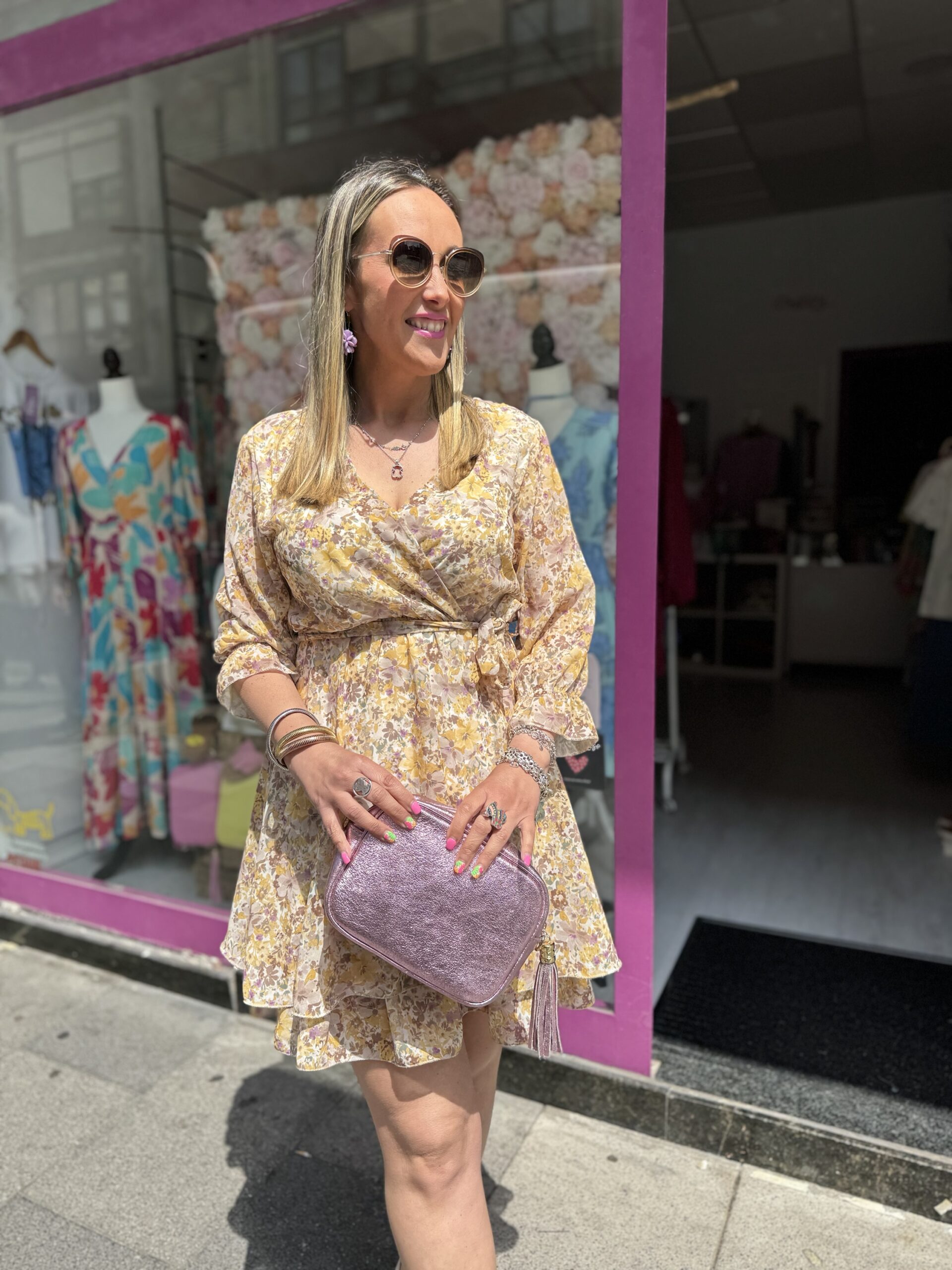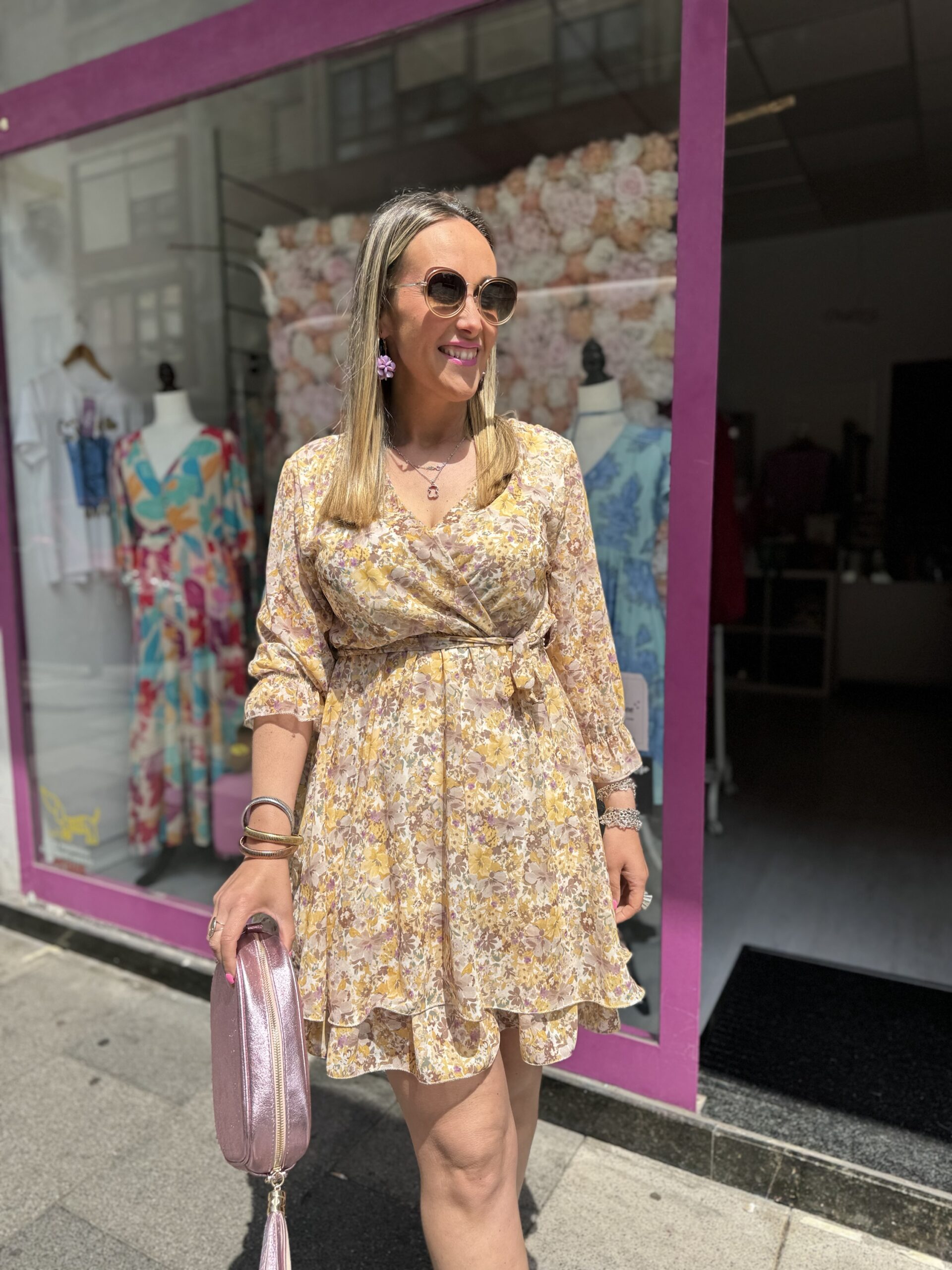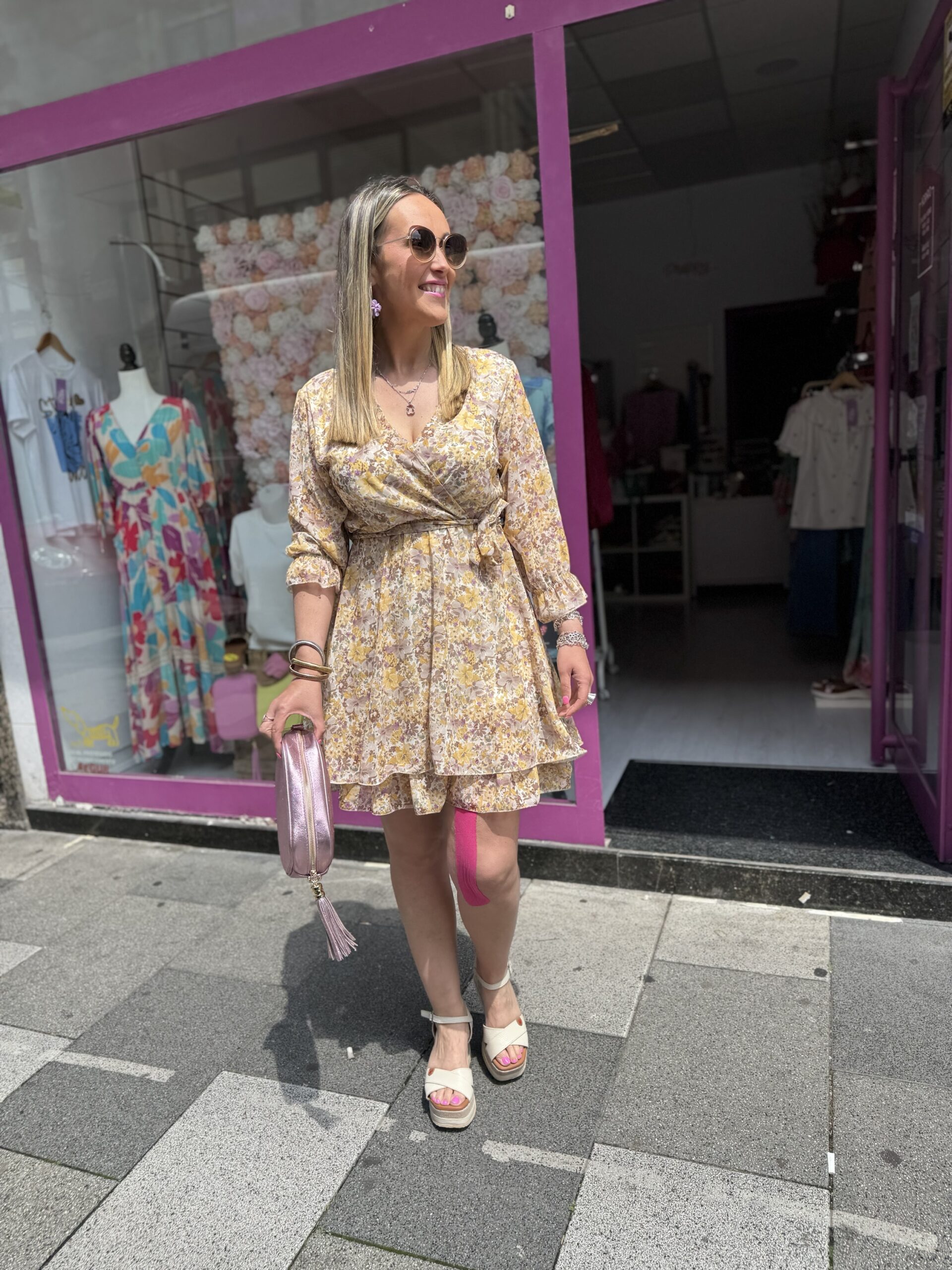 Vestido corto de manga por el codo de gasa semitransparente. Escote en pico y goma elástica debajo del pecho . Forro interior . Cinturón a juego