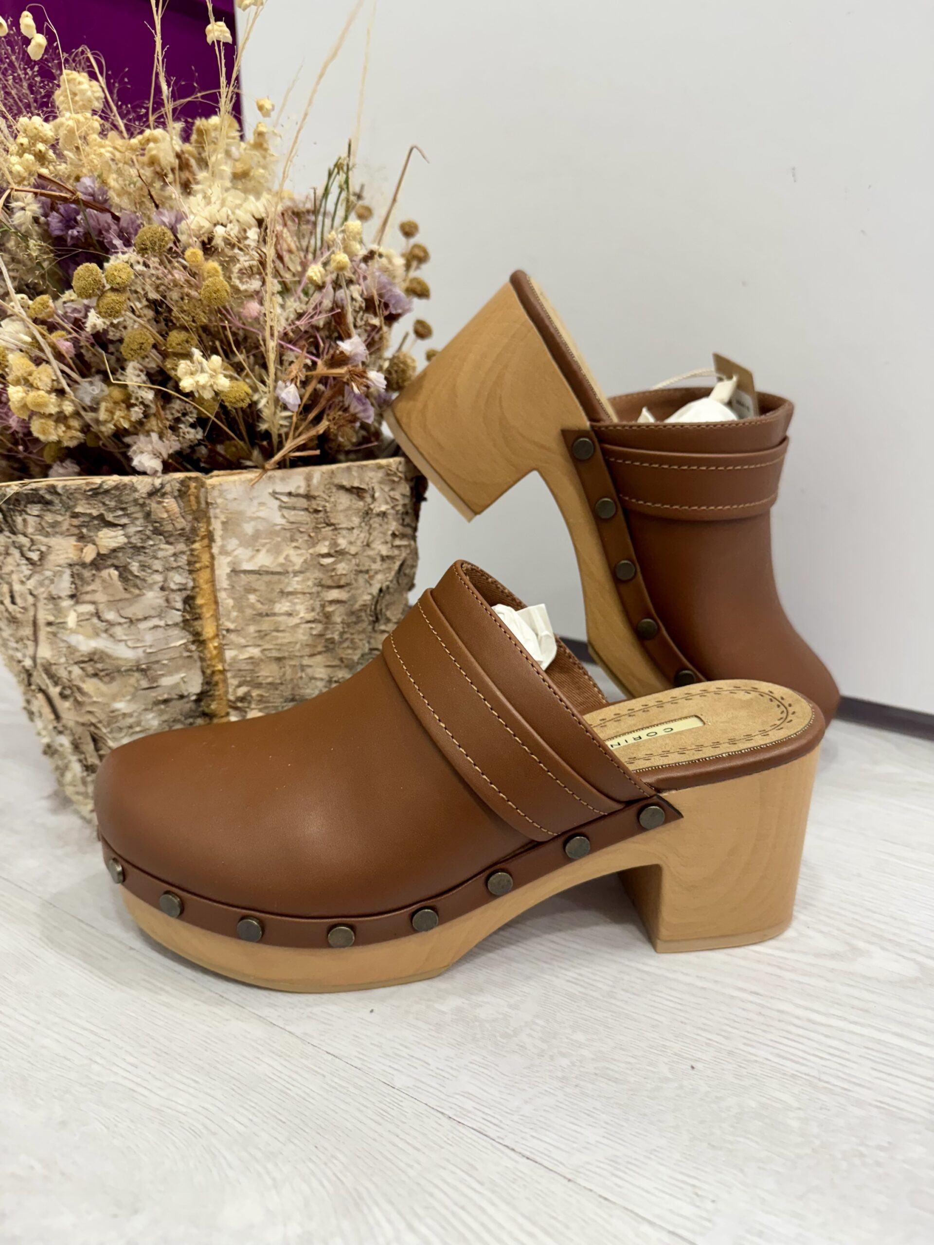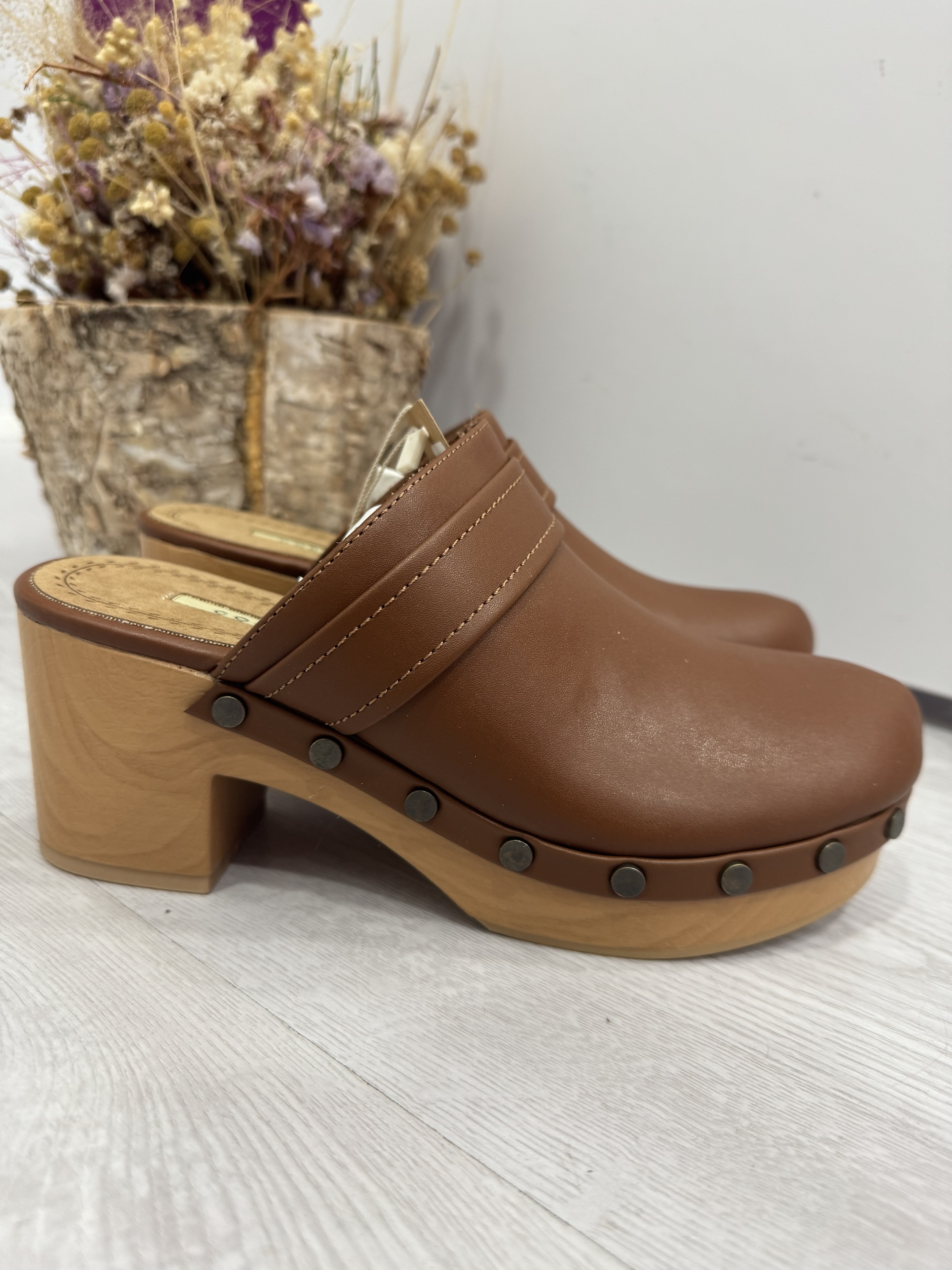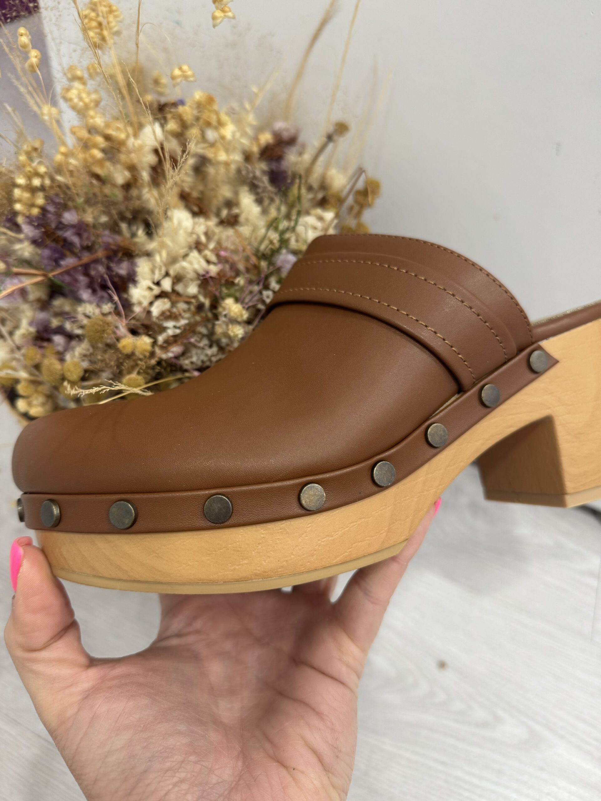 Zueco súper cómodo y ligero en color marrón de polipiel. Tacón efecto madera .
